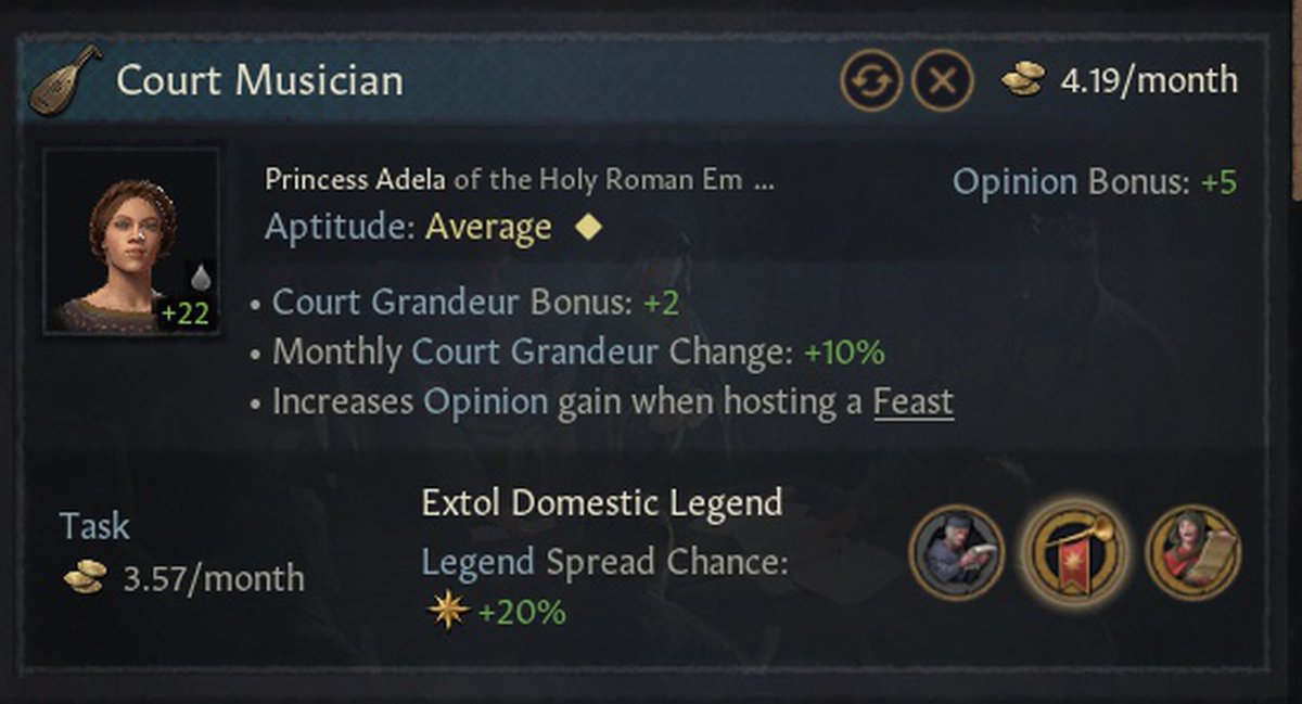 Для распространения легенды в своих владения и за рубежом пригодятся всякие придворные менестрели. Выбранное на скриншоте действие - распространять отечественную легенду.