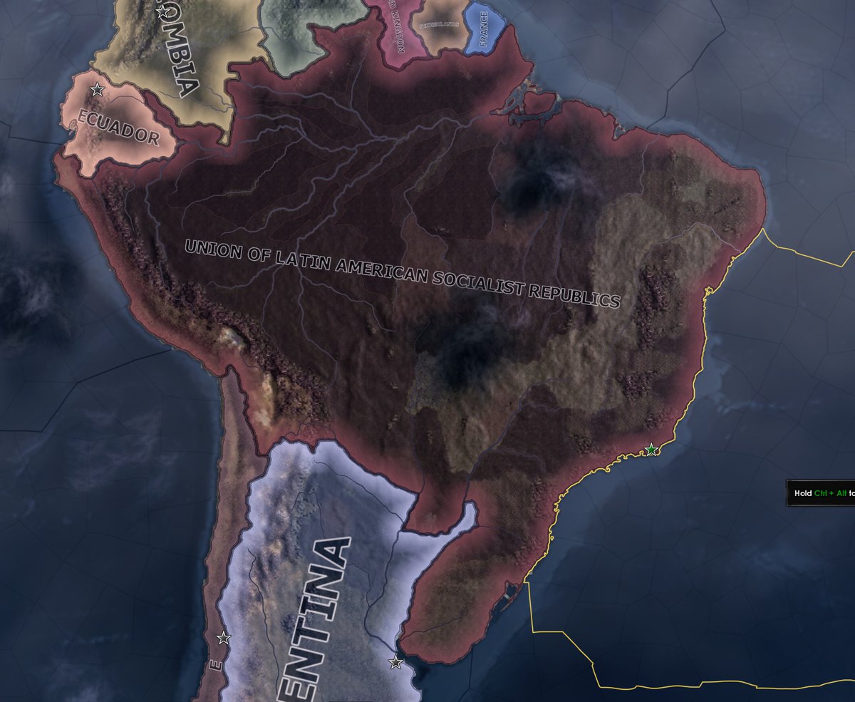 Пора обратиться к ранее упомянутой ветке добрососедских отношений с соседями. Можно, конечно, помогать антигитлеровской коалиции, но есть вариант прогнать с континента фашистов и коммунистов силами создаваемой новой фракцией южноамериканских государств.