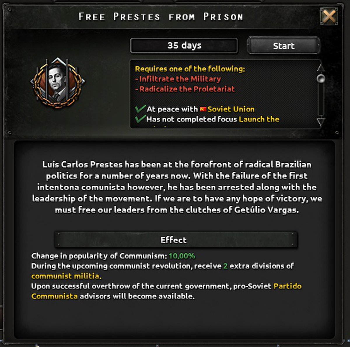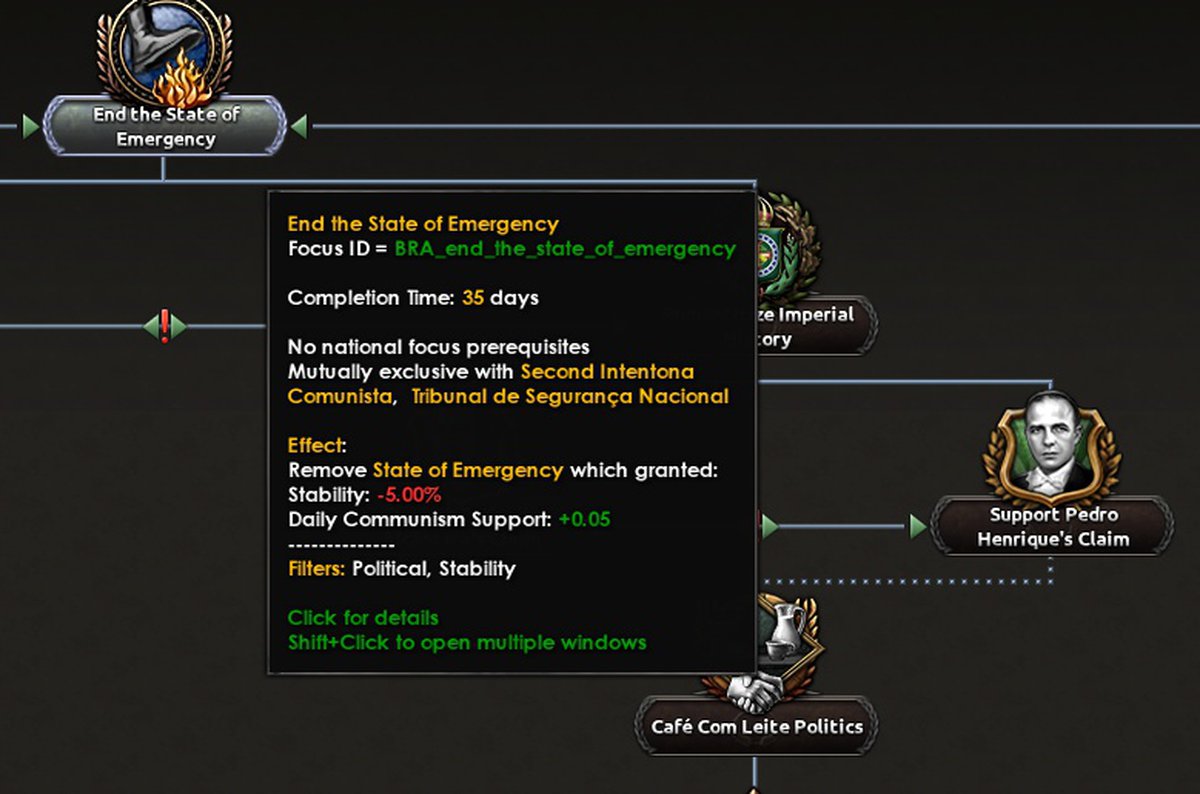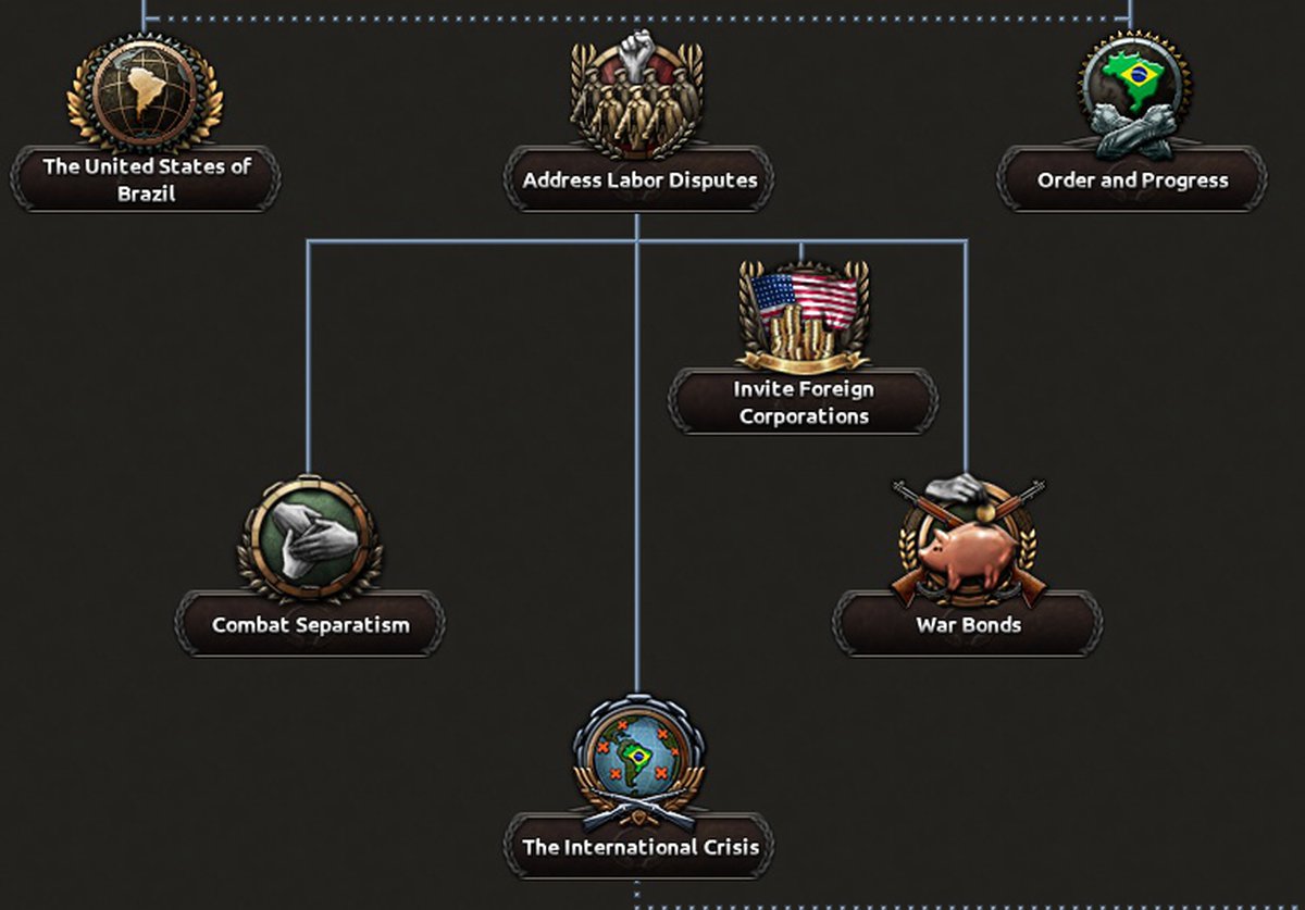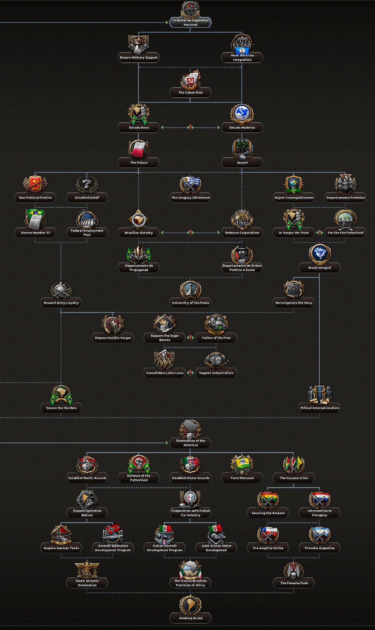 Развилка идёт после «Плана Коэна», в момент, когда исторически установилось Estado Novo, Новое государство. Вместо него можно выбрать Estado Moderno, и тогда в Бразилии будет установлен фашизм. Варгас станет лидером партии интегралистов, но это может продлиться недолго.