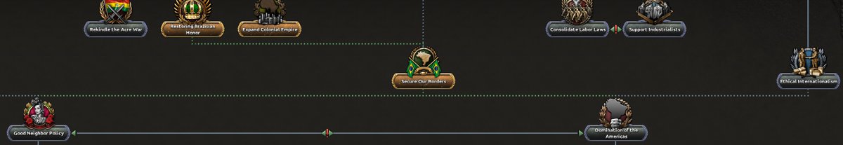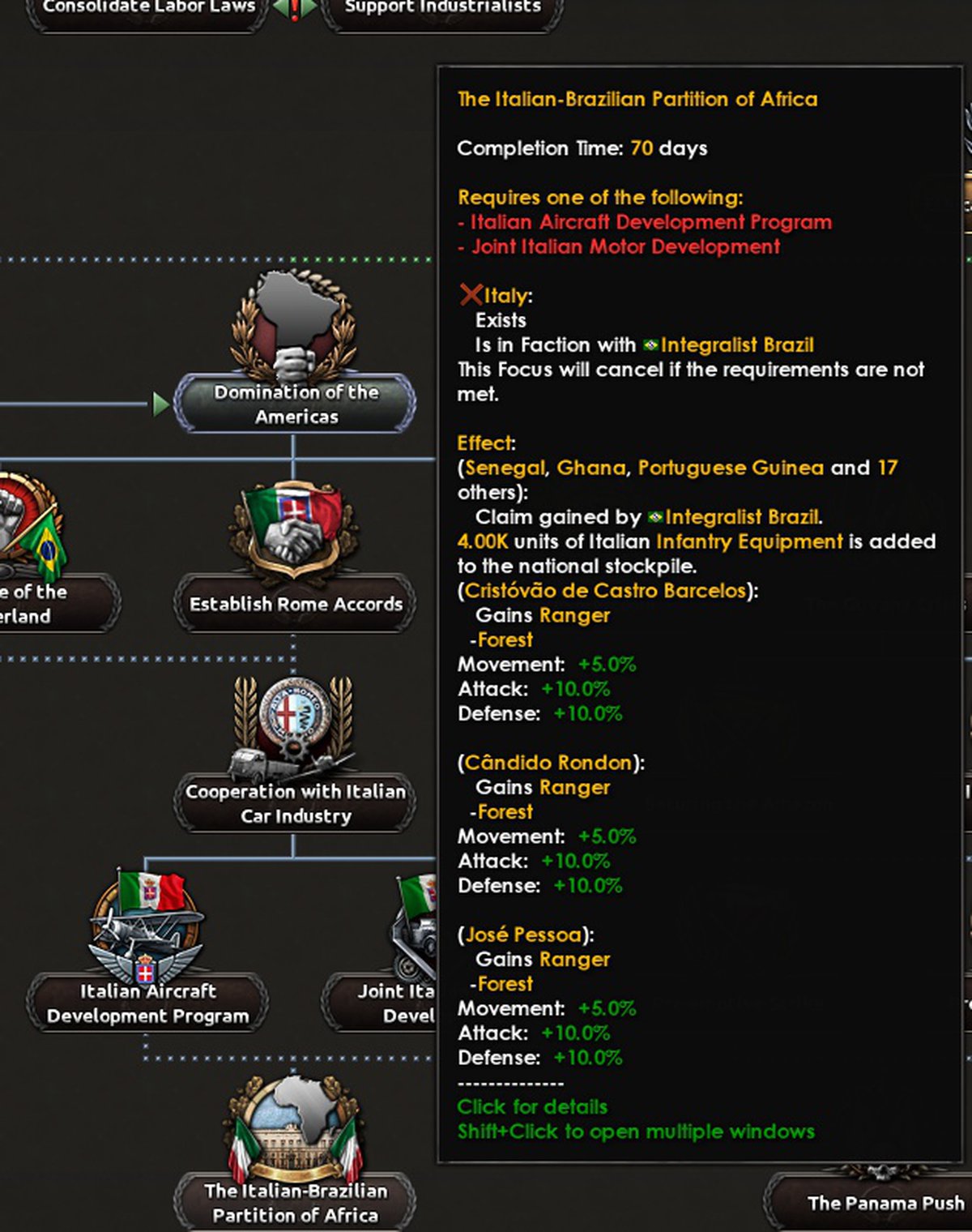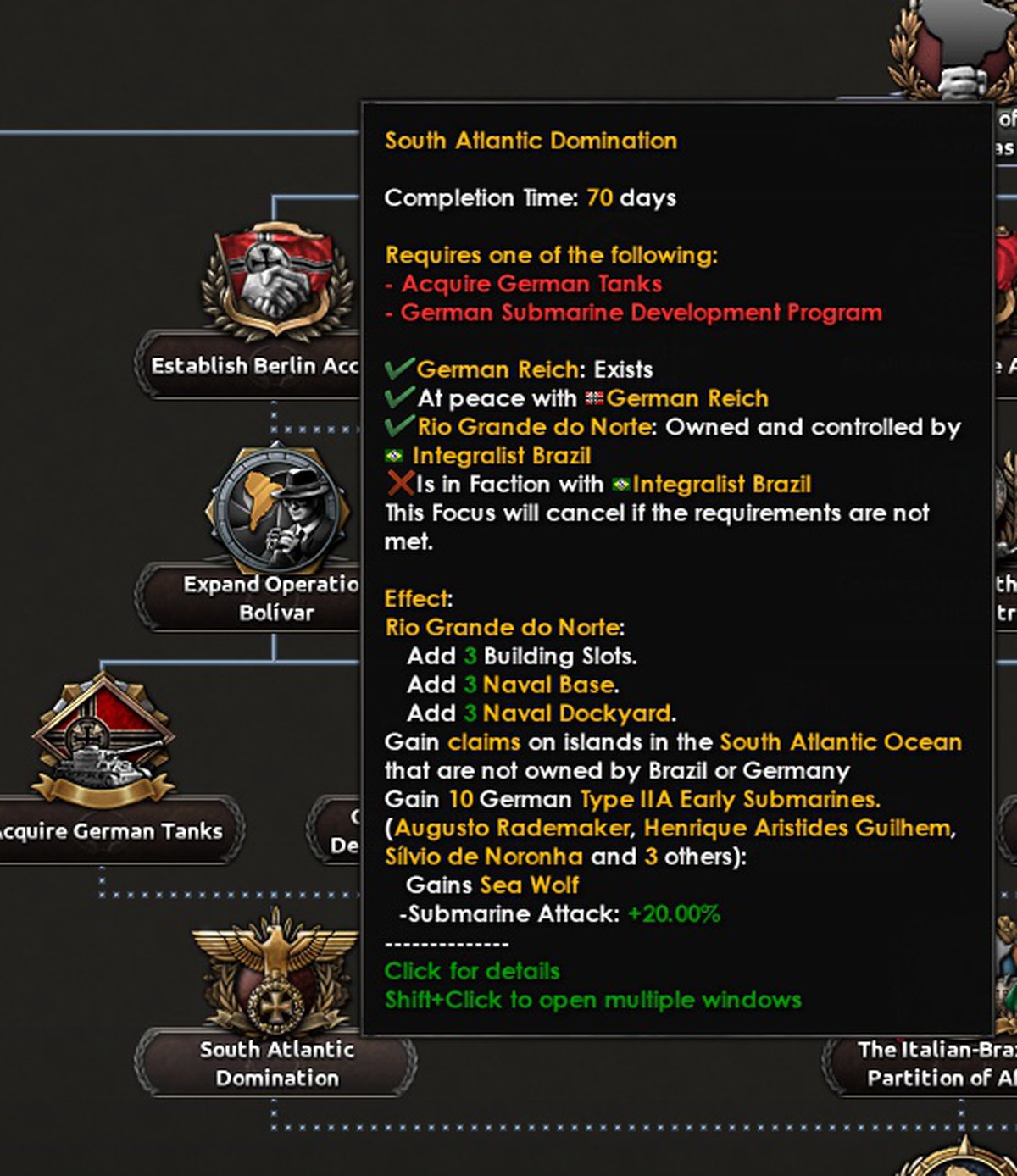 Рассмотрим ветку доминирования в Южной Америке. Тут есть 3 подветки: одна посвящена сотрудничеству с Германией, другая с Италией, а ещё одна самой экспансии.