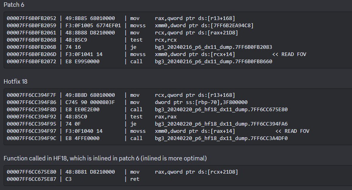Предполагается, что изменения в исполняемом файле Baldur's Gate 3 произошли из-за перенастройки системы сборки билдов, используемой разработчиками. В новом файле отключен инлайнинг: это позволило снизить размер файла, но поменяло структуру.