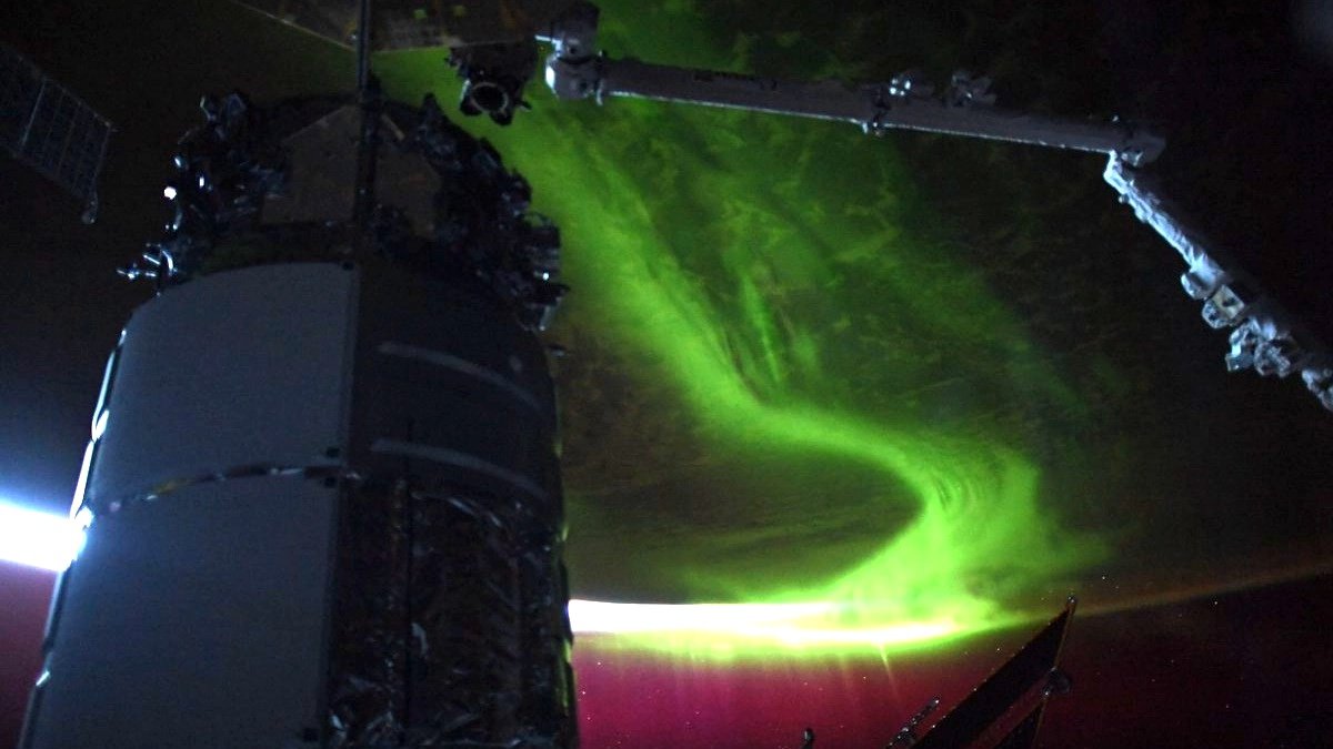 К сожалению, Жасмин Могбели не удалось снять северное сияние без посторонних предметов в кадре: здесь можно увидеть манипулятор Canadarm2 и один из модулей МКС, перекрывший обзор части Земли.