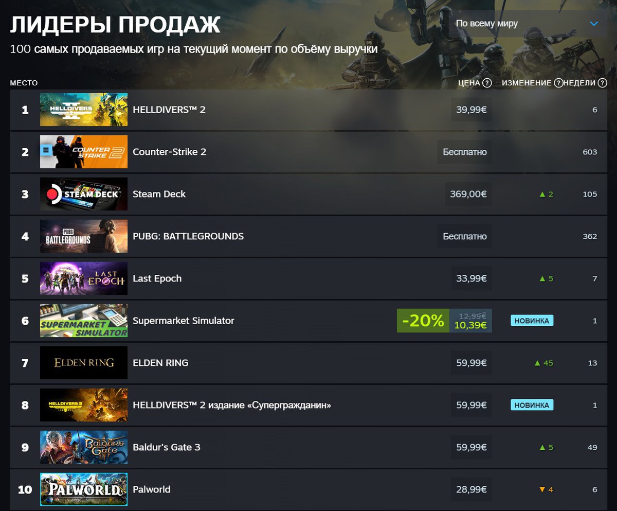 Прямо сейчас симулятор супермаркета, выпущенный 20 февраля, занимает 6 место в глобальном топе лидеров продаж Steam. Для сравнения: у популярного экшена Palworld только десятое место в топе.