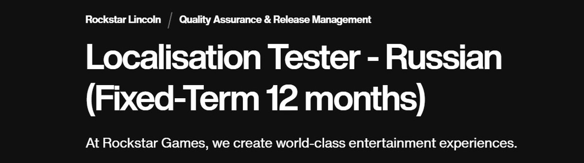 Студия Rockstar Linkoln, одно из британских подразделений Rockstar, опубликовала вакансию тестера локализации. Специалисту потребуется проверять перевод проектов компании на русский язык.
