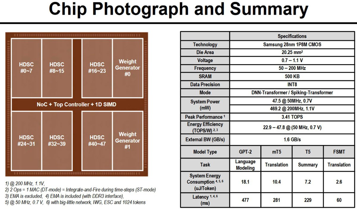Согласно работе, опубликованной сотрудниками Samsung, чип C-Transformer потребляет в 625 раз меньше энергии, чем чип Nvidia A100. Кроме того, чип Samsung в 41 раз меньше чипа Nvidia.