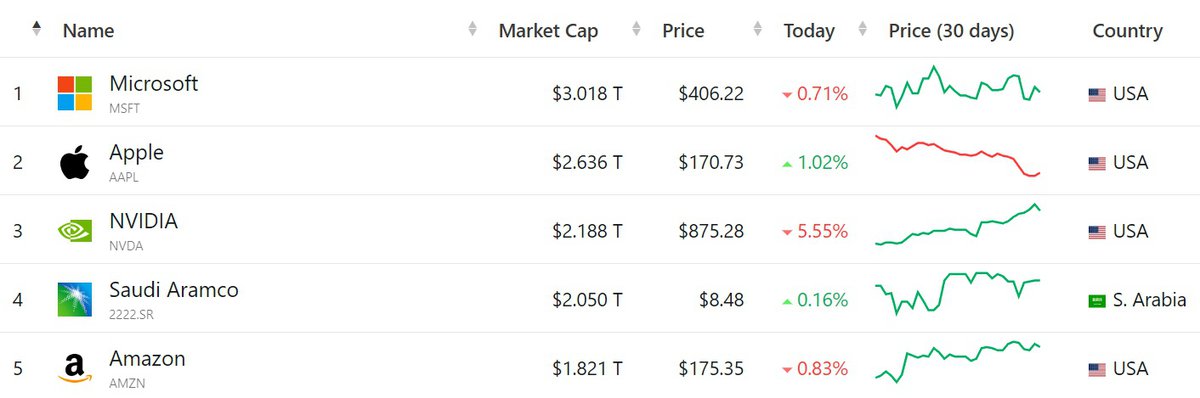 Примечательно, что в последний месяц капитализация Apple почти непрерывно снижается, а стоимость акций Nvidia, напротив, растет. Возможно, в обозримом будущем Nvidia все-таки выйдет на второе место в топ: для этого ее капитализация должна вырасти еще на $448 миллиардов.