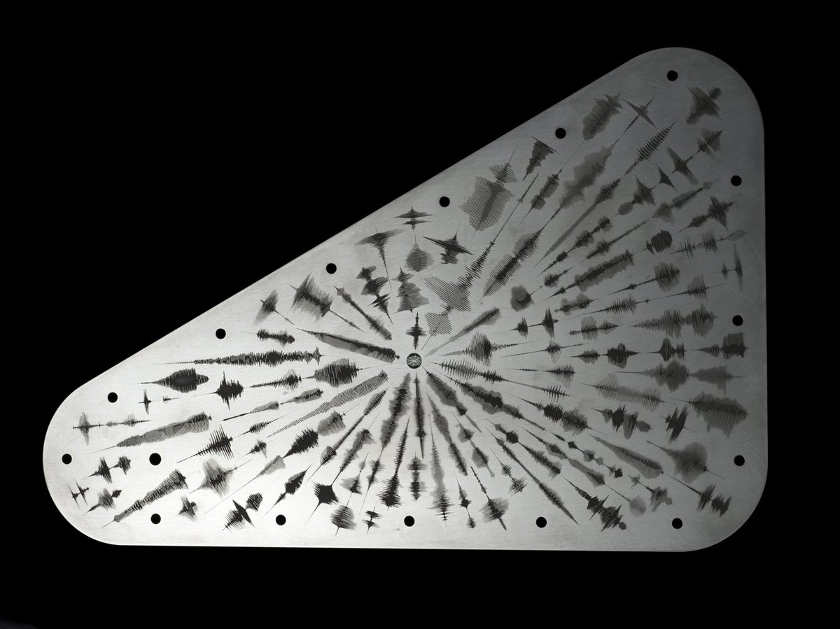 На другой стороне пластины нанесены формы волны. Это визуализация аудиосигналов, возникающих при произнесении слова «вода» на 103 земных языках. Полный список использованных языков не опубликован.