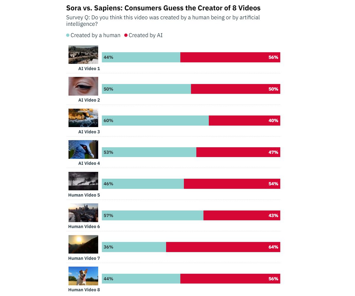 Видеоролики, создаваемые нейросетью Sora от стартапа OpenAI, способны вводить зрителей в заблуждение. К такому выводу пришли в Variety и HarrisX: компании провели исследование, в котором поучаствовало больше 1000 взрослых жителей США.