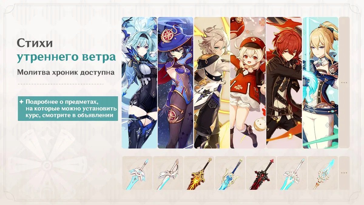 Молитва хроник — дополнительный баннер, в котором можно получить как персонажей, так и оружие с 5 звездами редкости. Сюда попадают только старые герои и оружие, баннер будет ограничен по времени: он доступен до 2 апреля.