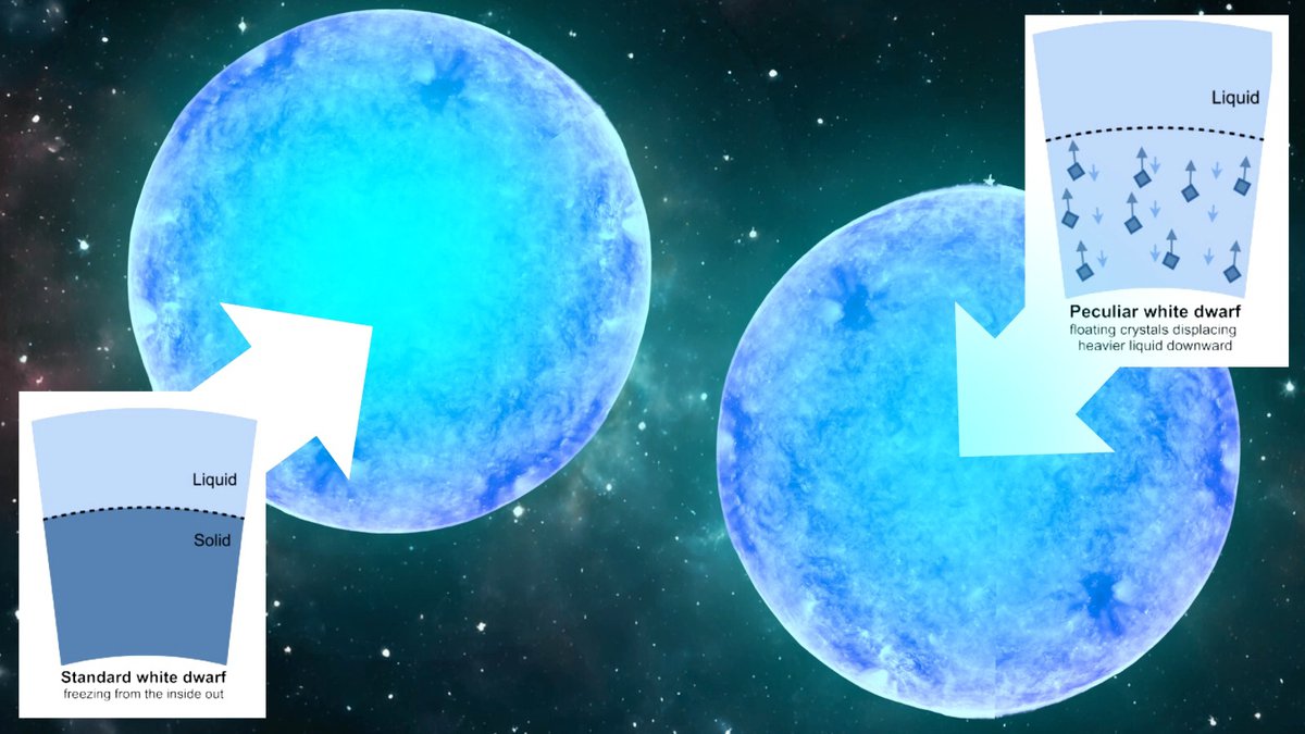 В результате вещества с разной плотностью начинают циркулировать, высвобождая гравитационную энергию. Она преобразуется в тепло и не дает белому карлику окончательно замерзнуть.