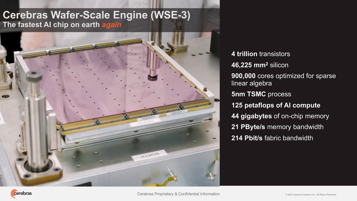 Процессор WSE-3 производится по 5-нм техпроцессу TSMC и несет на борту 4 триллиона транзисторов. Вычислениями занимаются 900 тысяч ядер, выдающих производительность в 125 петафлопс при вычислениях, связанных с ИИ.