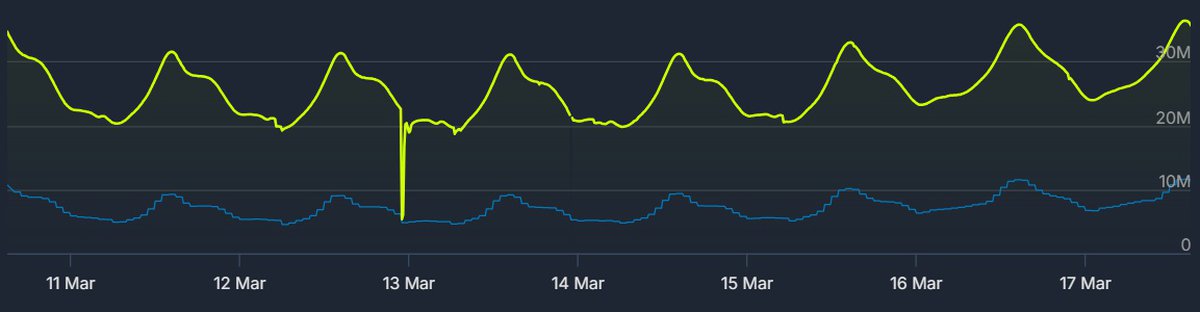 Интересный момент: за год, с 17 марта 2023 года, пиковое число одновременно активных игроков в Steam выросло примерно на полтора миллиона. Количество одновременно активных пользователей за это же время выросло на 3.3 миллиона.