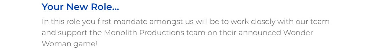Участие студии в разработке Wonder Woman упоминается в вакансии художника по левел-арту. Специалисту предстоит тесно сотрудничать со студией Monolith Productions, основным разработчиком Wonder Woman.
