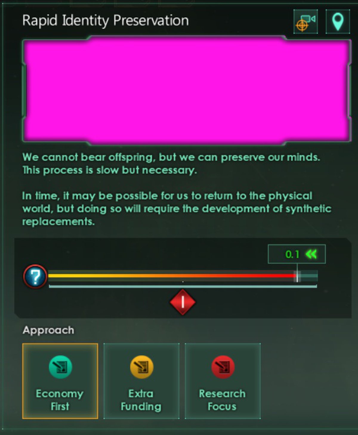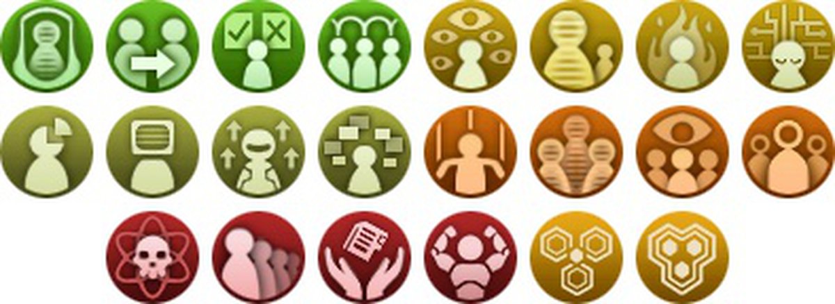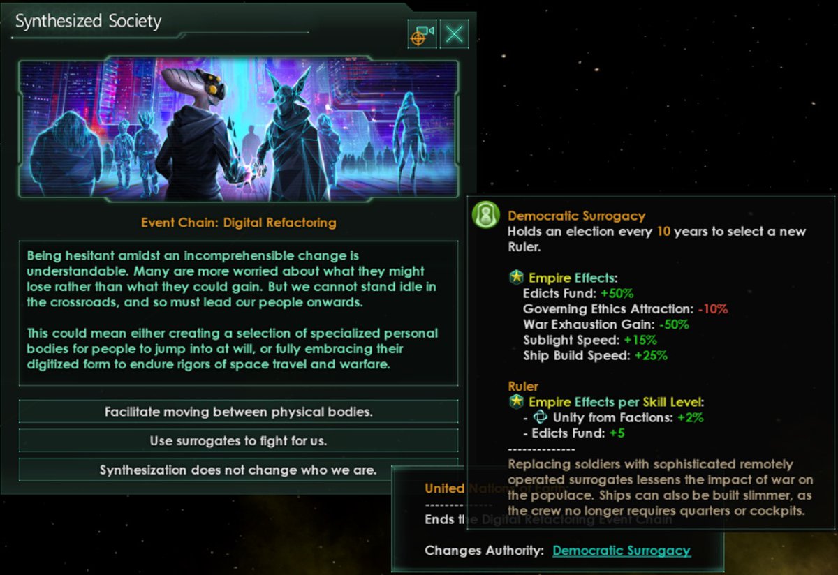 Для синтетиков главной темой цепочки событий, связанной с социальными эффектами, будет вопрос о том, на чём нужно сосредоточиться: на физическом или виртуальном мире. Например, для демократической формы правления появится продвинутая версия «Демократическое замещение», при которой солдаты и пилоты представляют собой дистанционно управляемые тела.