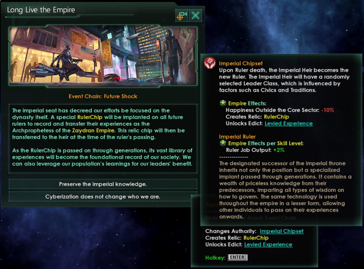 Правитель империи получит доступ к чипу правителя — новой реликвии, содержащей воспоминания и опыт прежних властителей. Когда правитель умирает, то его класс чиновника, командира или учёного даст бонусы его наследнику, когда тот взойдёт на престол.