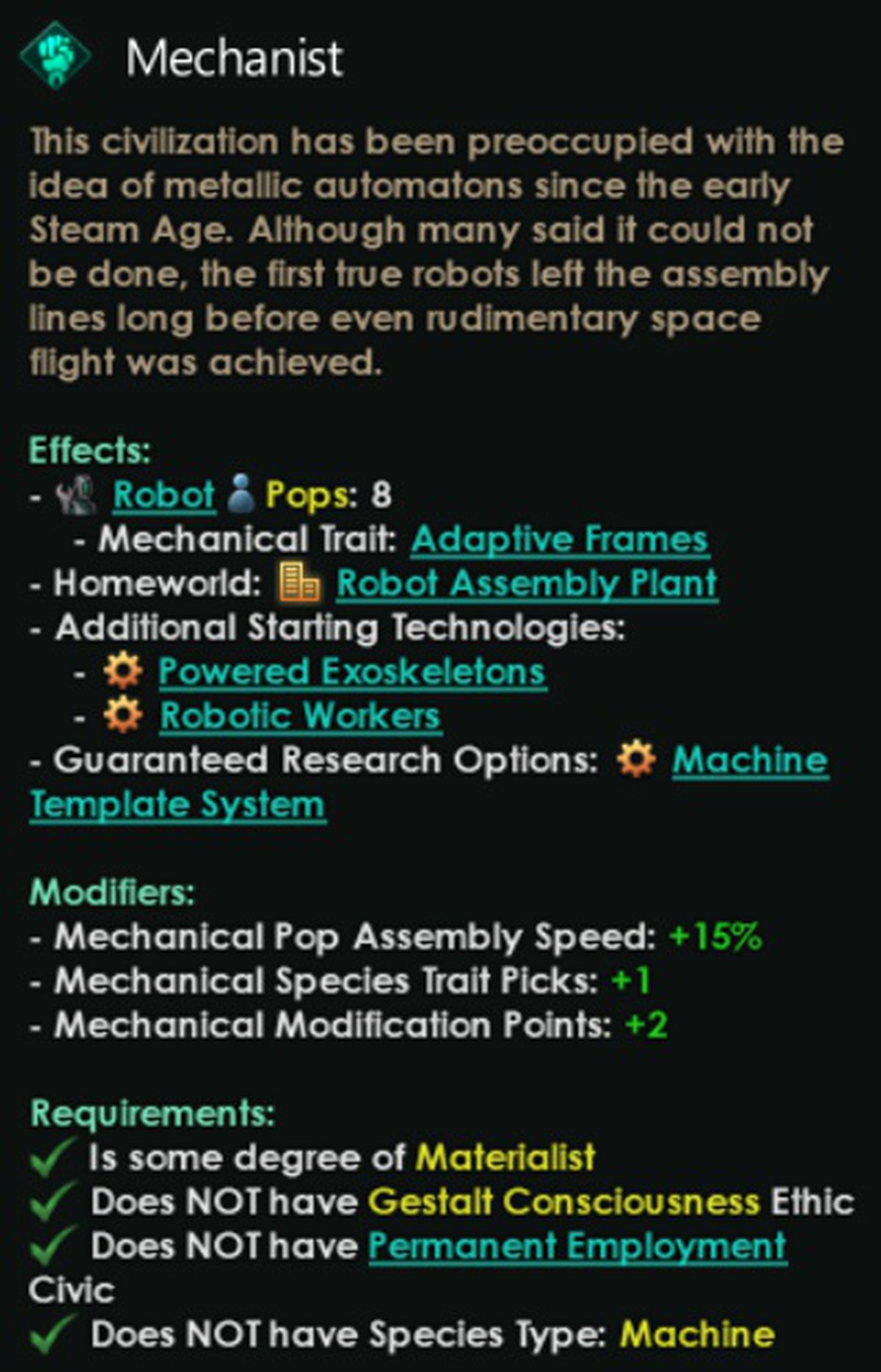 Государства, начинающие как машины, будь то машинный разум или отдельные машины, получат собственный инцидент вознесения под названием «Трансформация». И о нём тоже расскажут позже.