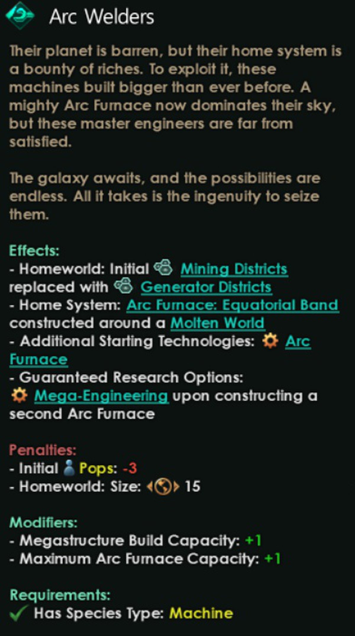 Переходим к Arc Welders или Дуговым сварщикам. Это государство машин, может быть гештальт-сознанием или с отдельными личностями. Родная планета бедна на ресурсы, поэтому их взор устремлён к звёздам.