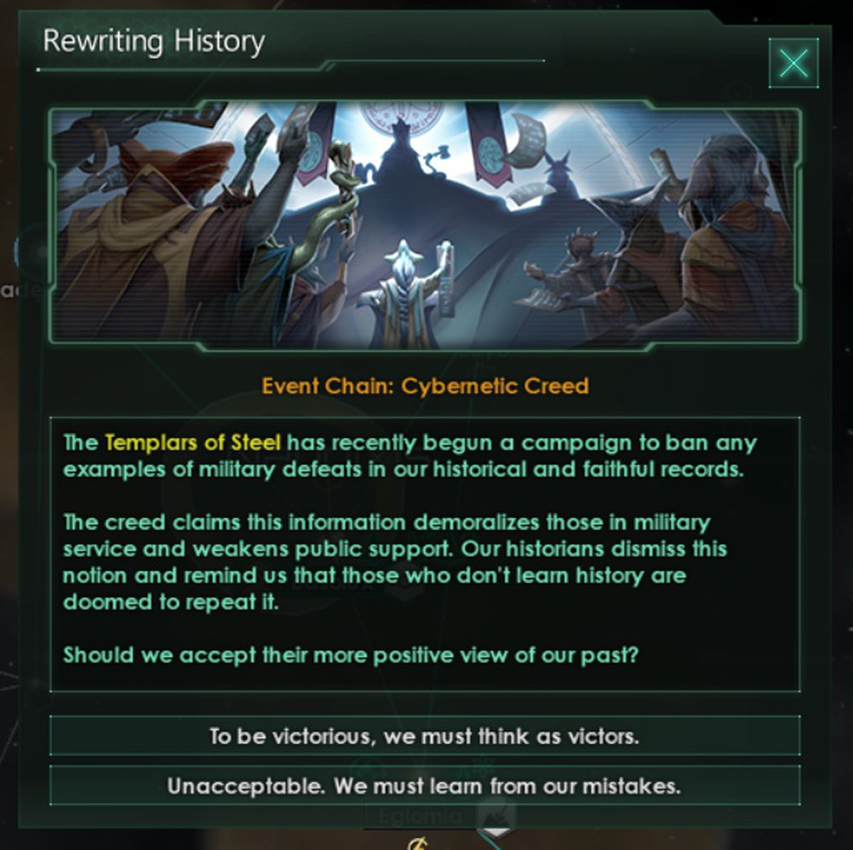 Как только начнётся божественная миссия и откроется дерево традиций кибернетики, запустится инцидент «Конклав слияния». Нужно будет направить свою веру, определив её доктрины и финальную форму вашего физического сосуда.