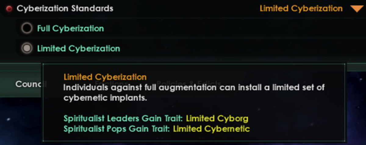 Первое происхождение называется Cybernetic Creed или Кибернетическое братство. На странице дополнения в Steam перевели, как вера кибернетики, но этот вариант не отражает суть. Cпиритуалистичное население и лидеры начнут с чертой «Ритуальная кибернетика», отображающей долгие стремления вида достичь идеального слияния плоти и стали.