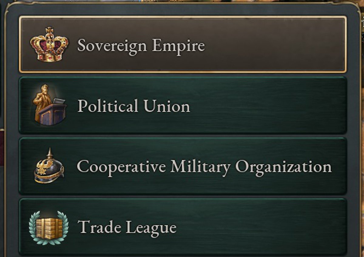 Далее очень важен центральный столп идентичности. Он определяет тип блока. Будет ли это империя, лидер которой при определённых условиях вассализирует своих членов, или же это торговая лига, которая по-умолчанию добавляет всех участников в таможенный союз под главенством лидера. И ещё 2 типа конкретно не описаны, но они явно про политические и военные соглашения.