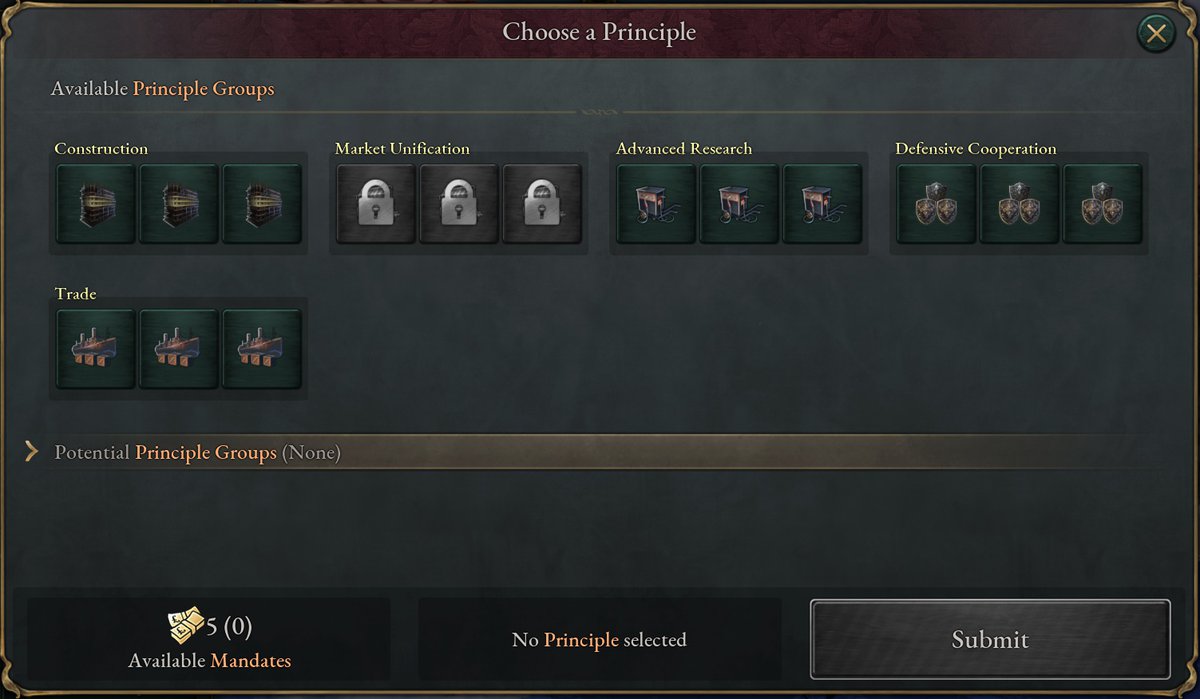 После создания блока можно будет вносить новые принципы, для этого понадобится копить специальные очки. Скорость накопления будет зависеть от столпа блока и входящих в него стран. Важно и качество участников, великие державы дадут больше очков, чем мелкие.