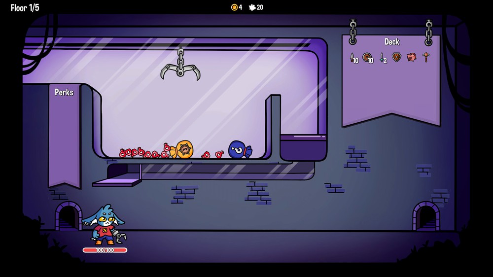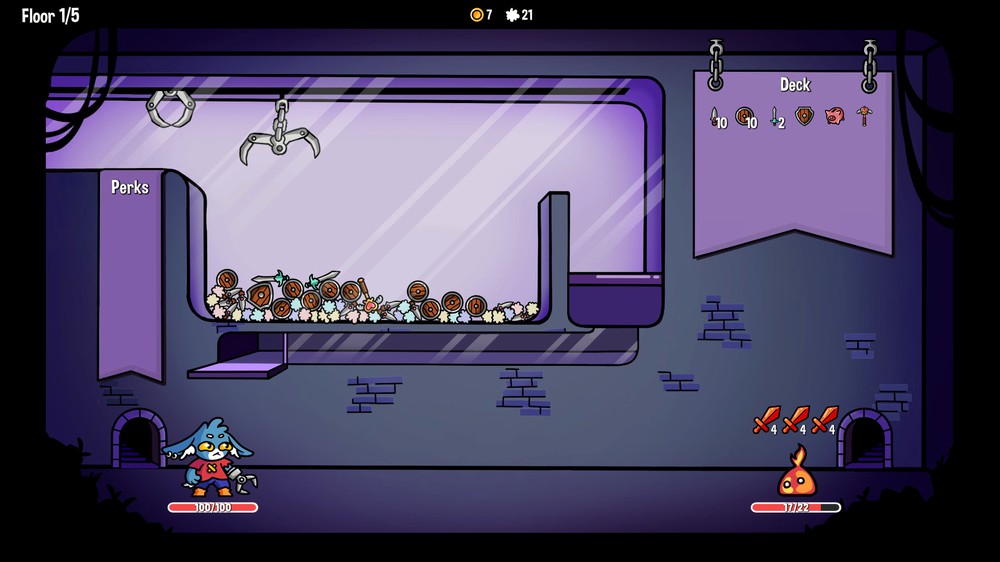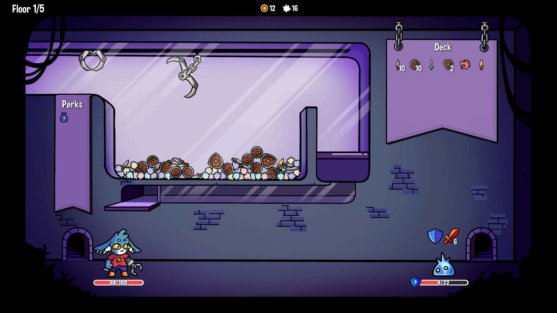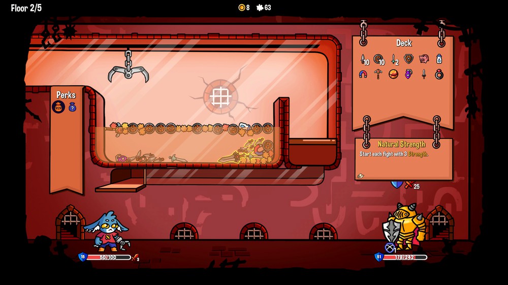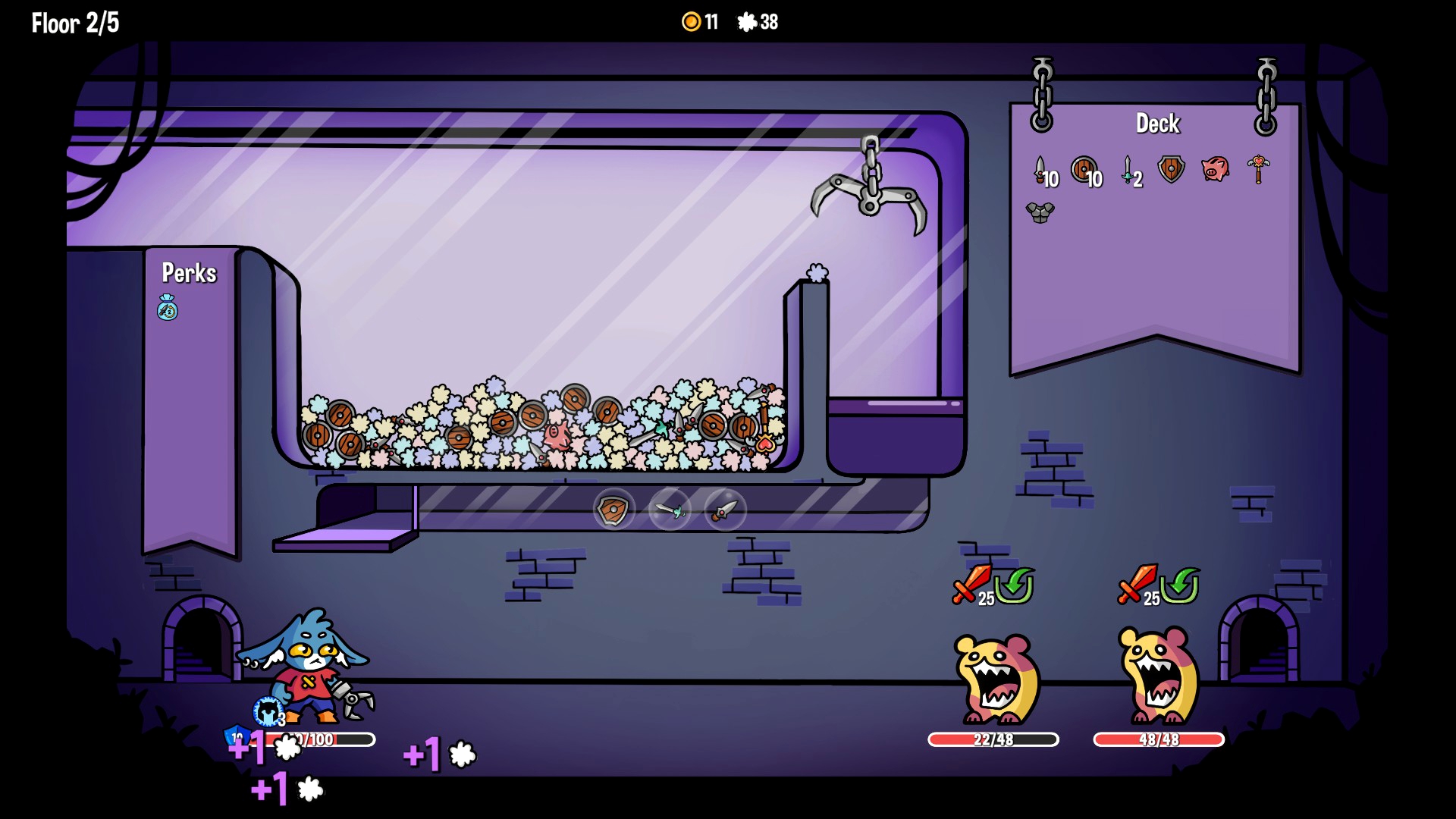 Конечно, на самом деле глобальная карта - это не главное. Самый сок игры - боевая система. Dungeon Clawler - это пошаговая карточная игра, но не совсем. Смысл в том, что всю колоду вываливают в автомат в виде предметов, которые надо вылавливать хваталками, чтобы использовать.