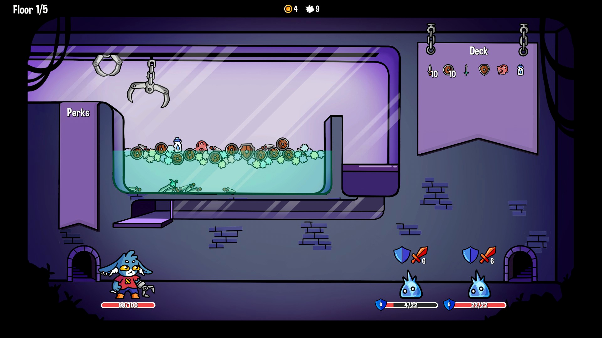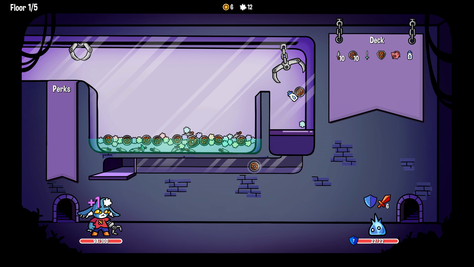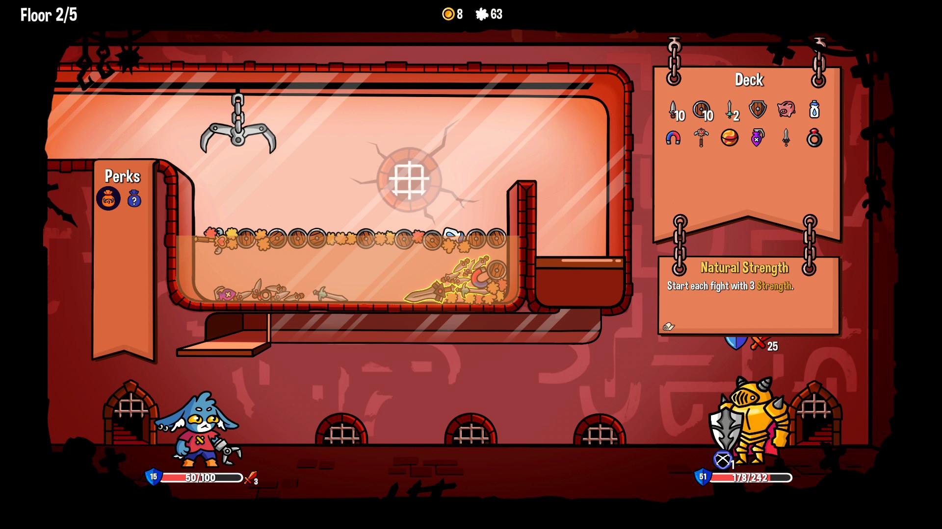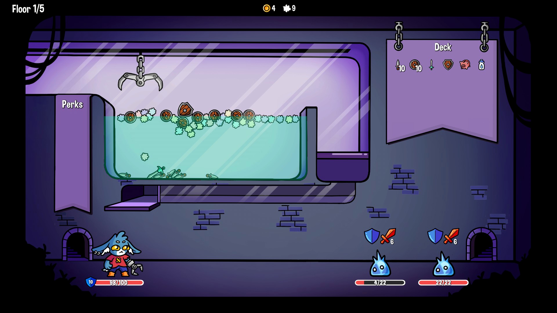 Конечно, на самом деле глобальная карта - это не главное. Самый сок игры - боевая система. Dungeon Clawler - это пошаговая карточная игра, но не совсем. Смысл в том, что всю колоду вываливают в автомат в виде предметов, которые надо вылавливать хваталками, чтобы использовать.