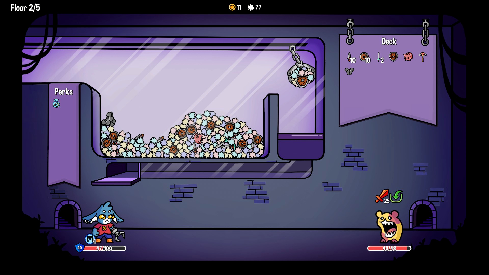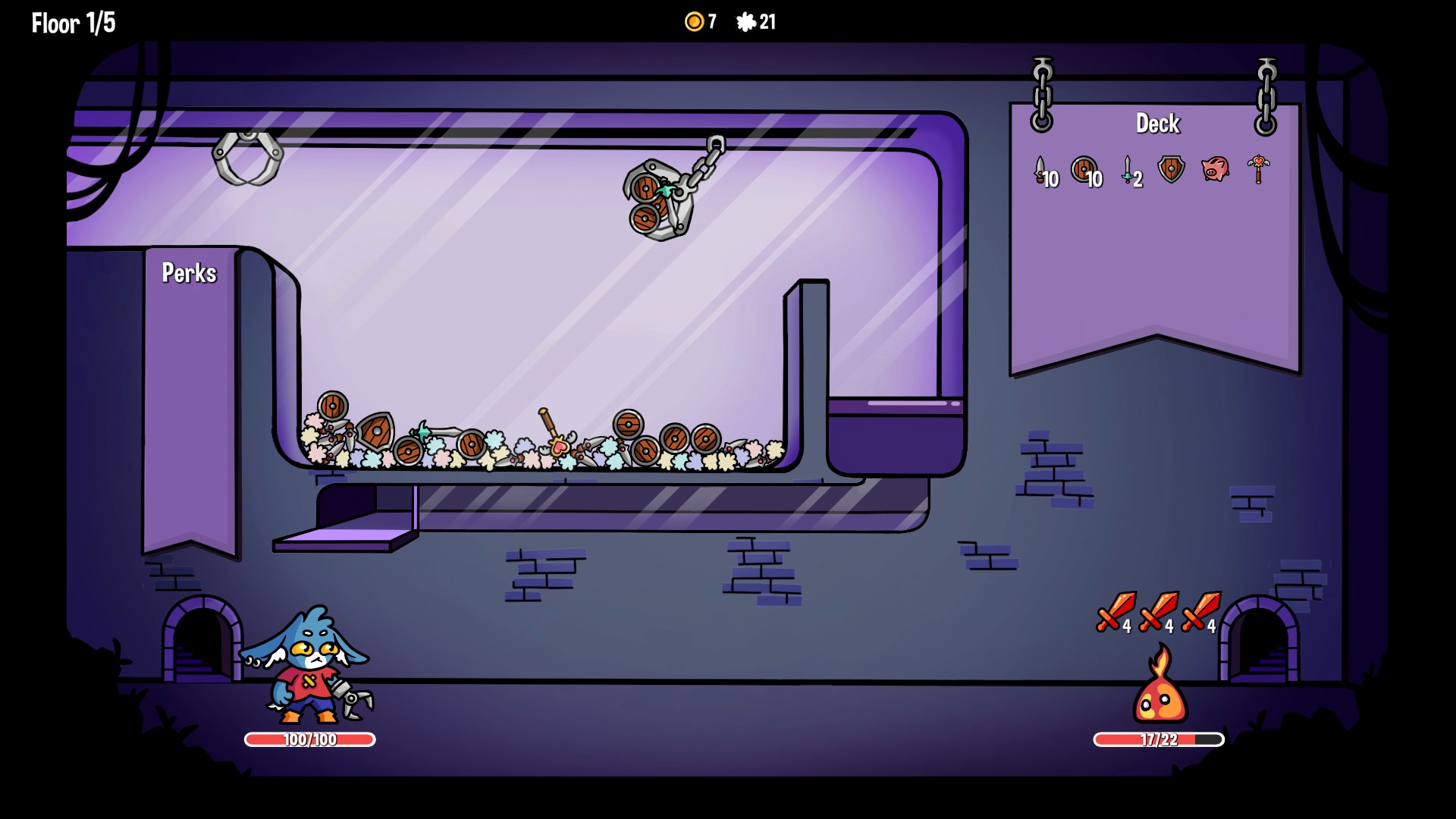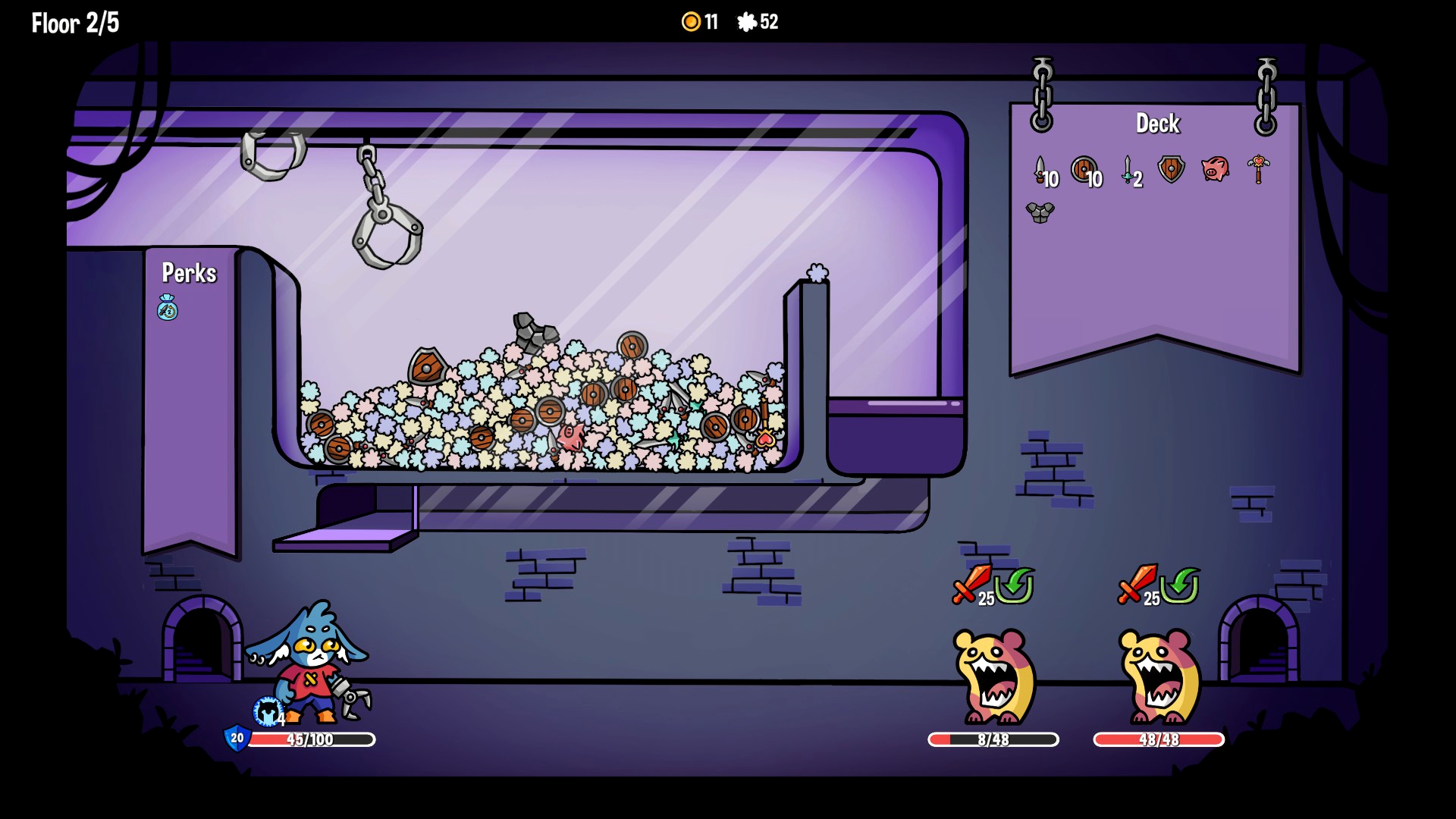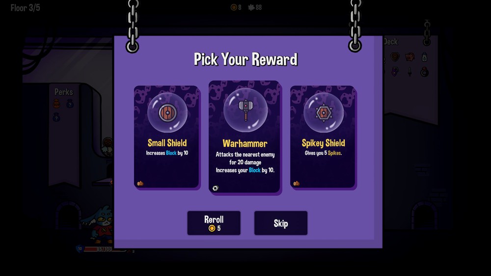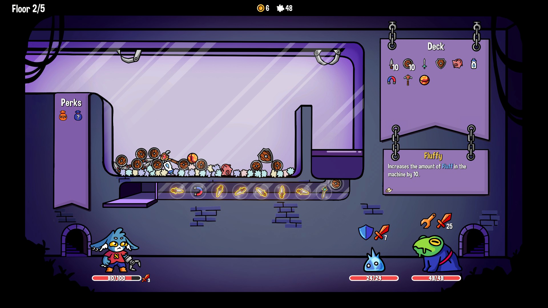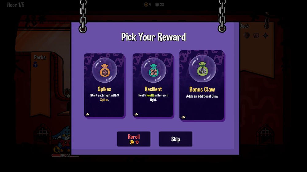 Автомат - это главная механика. Нужно сказать, что также имеются в игре перки. Иногда дают их в конце боя. Конкретно, за победы над боссами. Есть навыки на +3 атаки, 5 лечения после сражения, 3 единицы ответного урона и т.п. Из интересного стоит отметить перки на:
