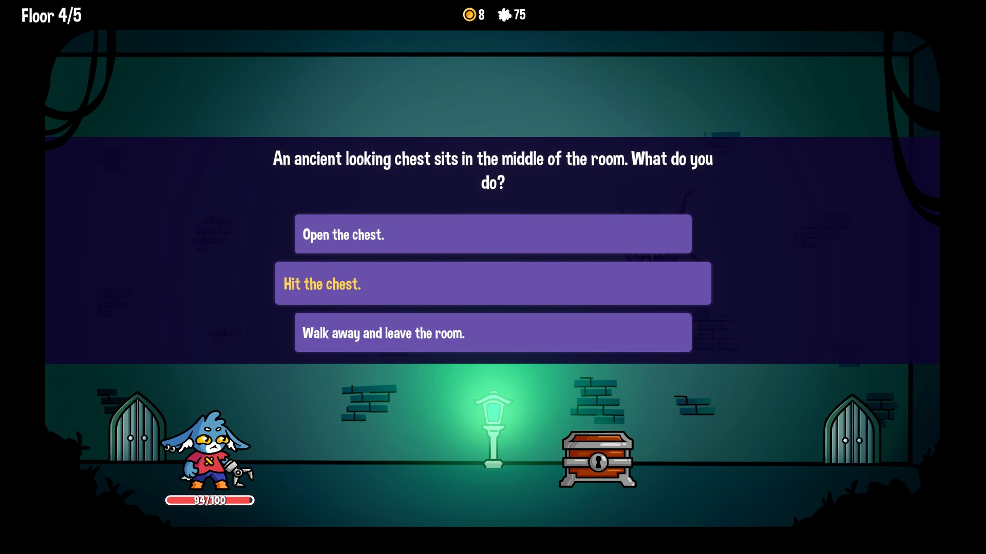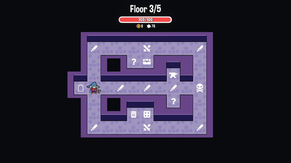 Теперь к самой игре. Подземельный хвататель представляет собой смесь жанров. Отчасти это подобие рогалика, причём не мягкого. Герою предстоит путешествовать по неким коридорам. Нужно выбрать маршрут, учитывая боевые столкновения на пути, а также полезные штуки. Задача - добраться до босса, победить его и потом тоже самое делать на следующем этаже.