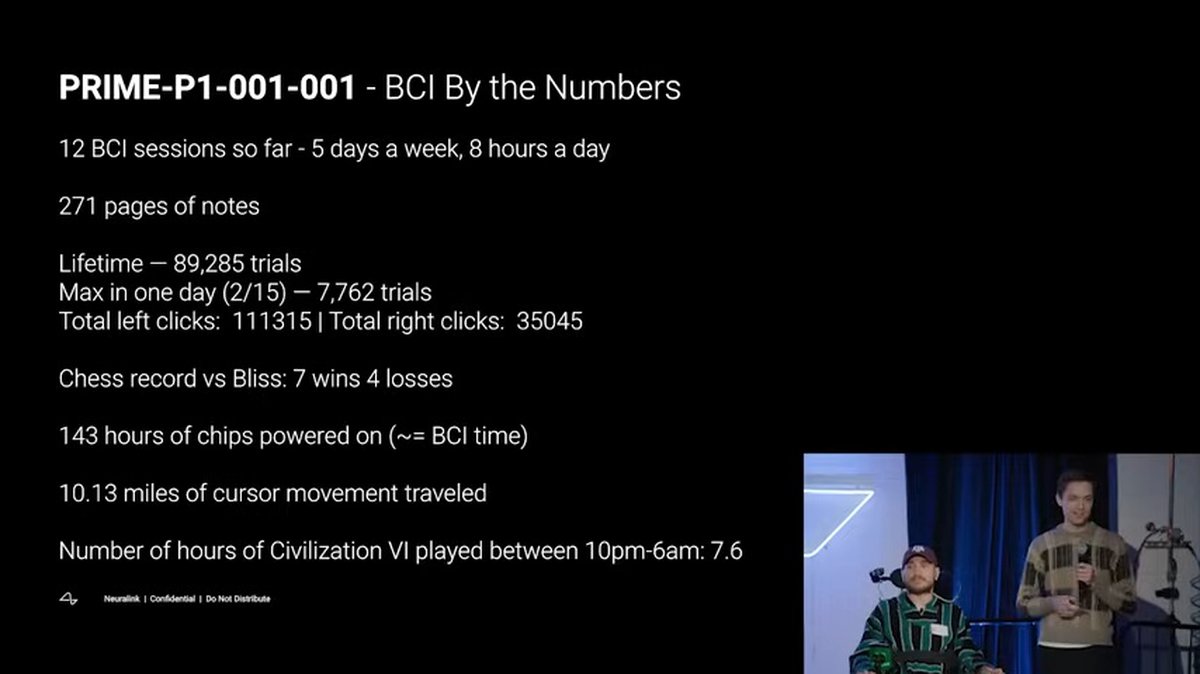 Согласно статистике, раскрытой в ходе презентации, за все время Ноланд совершил 111315 мысленных кликов левой кнопкой мышки и 35045 кликов правой кнопкой. Курсор мышки под его управлением преодолел больше 16 километров.