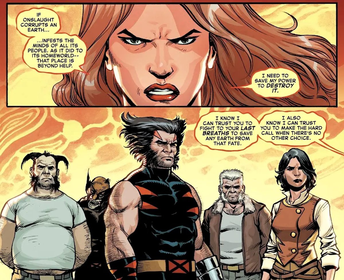 Кристос: Я не хочу раскрывать слишком много, но скажем так, он живет долго и счастливо, и явно не с Джин, поскольку это родной мир Феникса, который курирует наших пятерых альтернативных Росомах. И снова Йылдирай и колорист Нолан Вудард проделали потрясающую работу, выделив этого Росомаху среди других. Увидев его рядом с Росомахой Земли X, вы их не перепутаете.