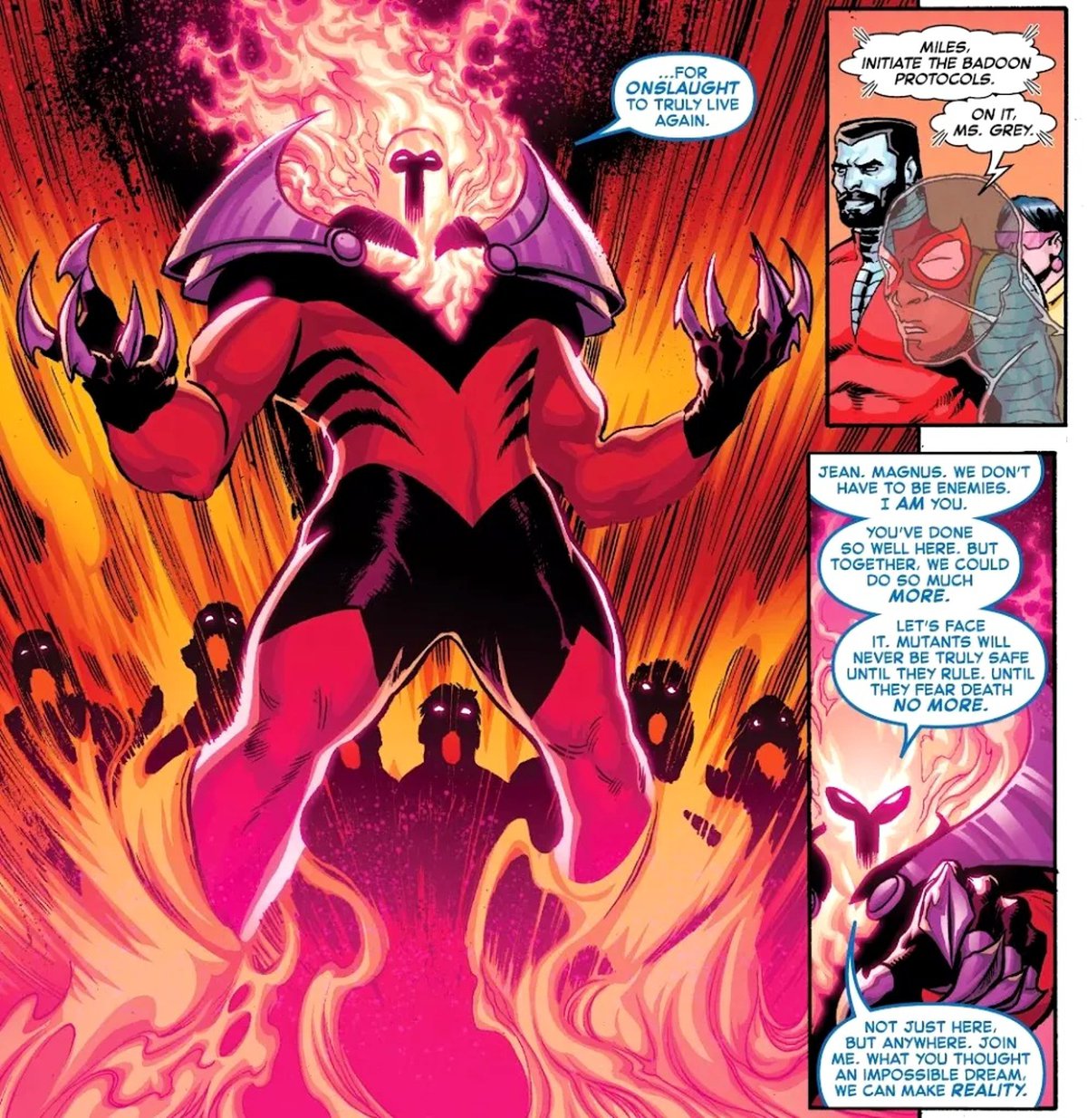 Страшная сущность появилась в одной альтернативной вселенной комиксов Марвел. А именно, особая версия Натиска (Onslaught), в которую соединились сознания Джин Грей и Магнето. Тварь эта может летать по мультивселенной, подчинять местных обитателей, уничтожая эти измерения.