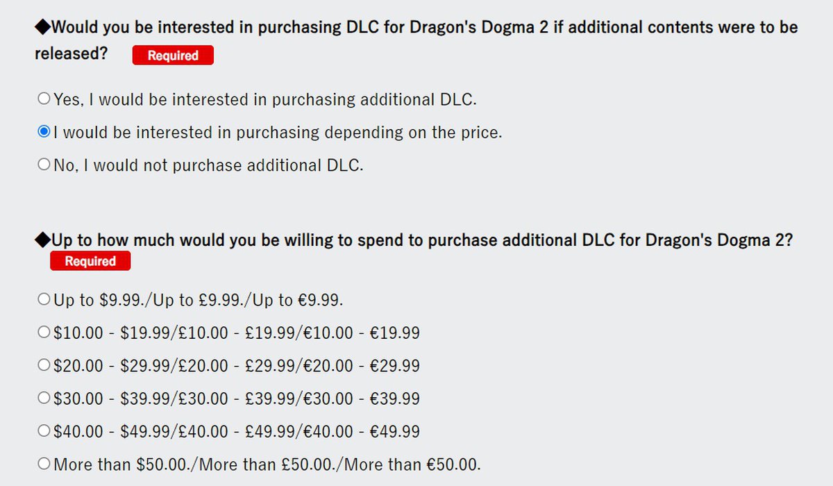 Во-первых, разработчики хотят знать, заинтересованы ли игроки в выпуске дополнения к Dragon's Dogma 2. Во-вторых, в Capcom интересуются, сколько фанаты готовы заплатить за такое дополнение. На выбор предлагается несколько вариантов: от «до $10» и до «более $50».