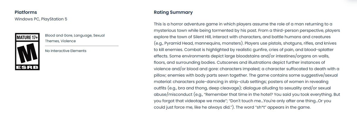В основном специалисты агентства выдали ремейку Silent Hill 2 рейтинг M из-за насилия. Во время прохождения игроки увидят брызги крови, внутренние органы и разнообразные жестокие сцены.