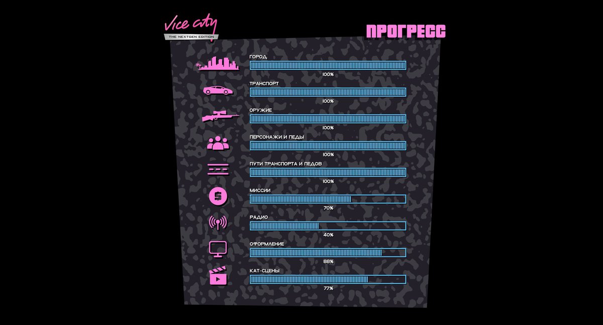 Готовность заданий оценивается на уровне 70%, готовность катсцен чуть выше — 77%. Кроме того, перед релизом надо доделать радио и разобраться с оформлением. Обратите внимание: в ремастер перенесут все сюжетные задания, но лишь часть побочных.