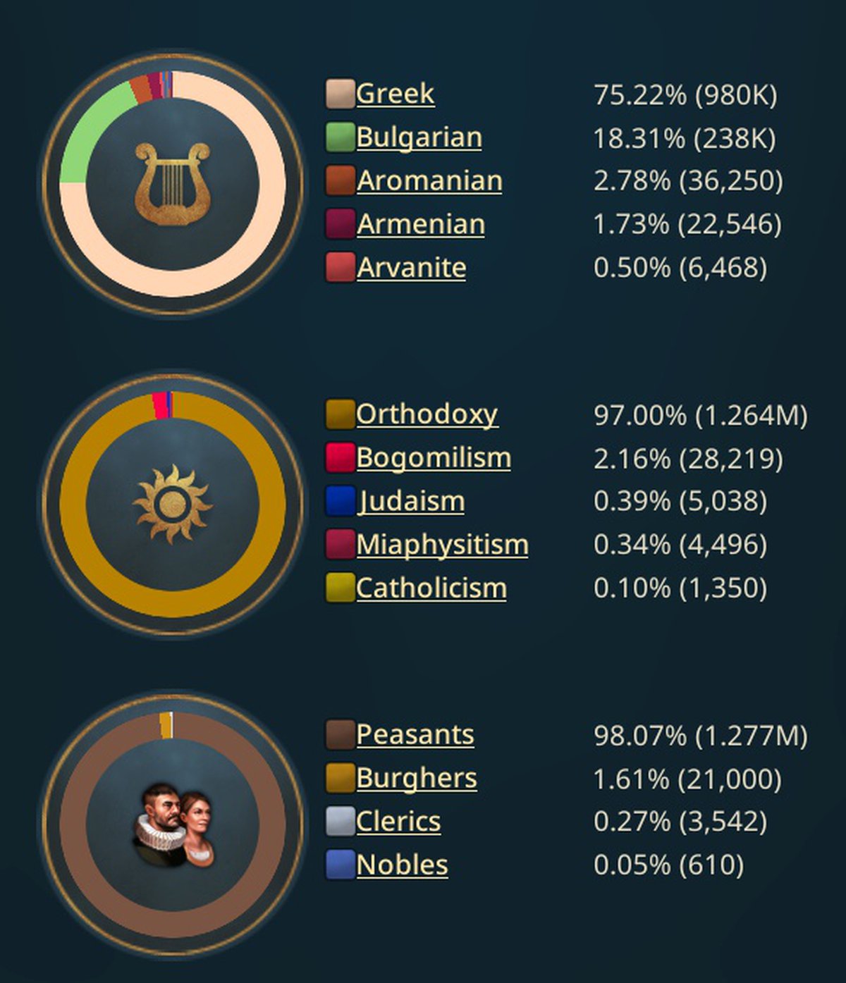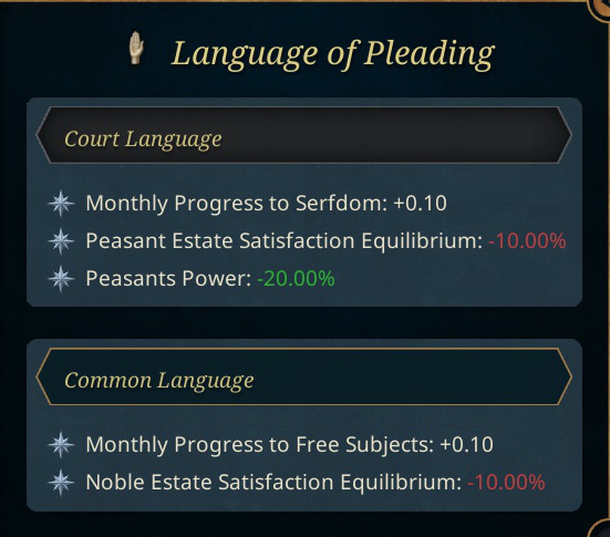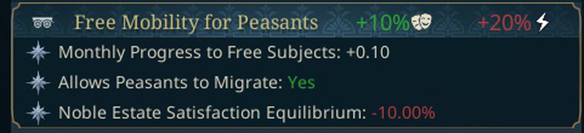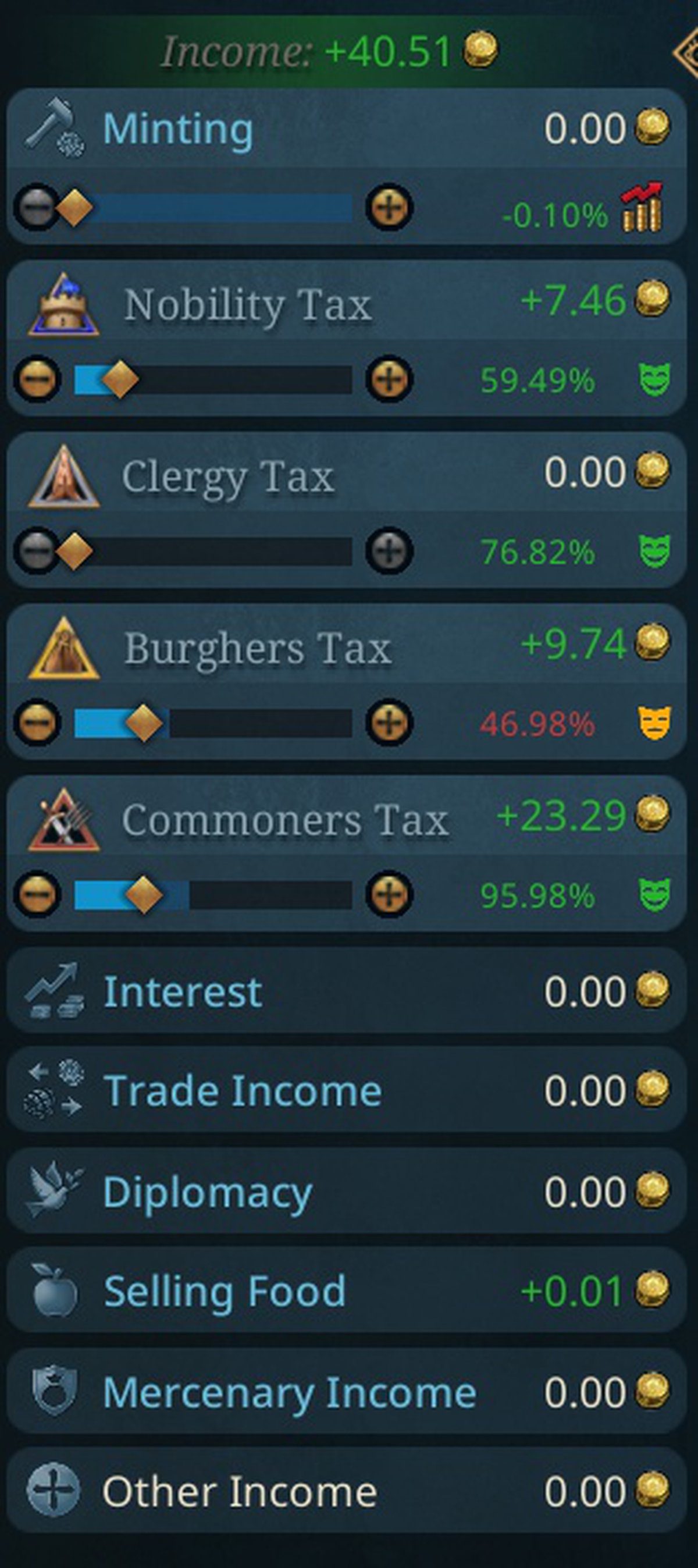 Удовлетворённость сословий тоже на это будет влиять. Если она выше 50%, то даст бонусы, ниже - штрафы. Если удовлетворённость ниже, сословие перестанет поставлять войска. Также неудовлетворённое сословие будет создавать повстанческие группировки или даже устраивать гражданские войны. А ещё: