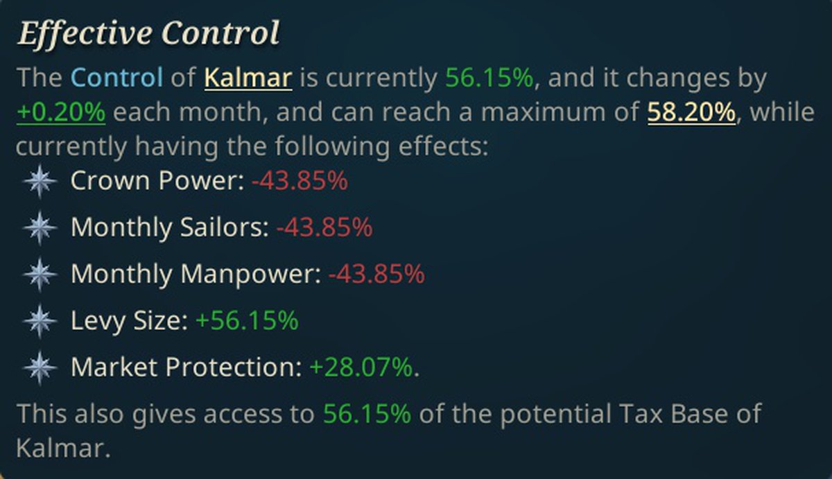 Есть ещё показатель контроля у владений. В первую очередь он зависит от удалённости от столицы или другого источника власти в стране. Ещё сословные привилегии могут его дать.