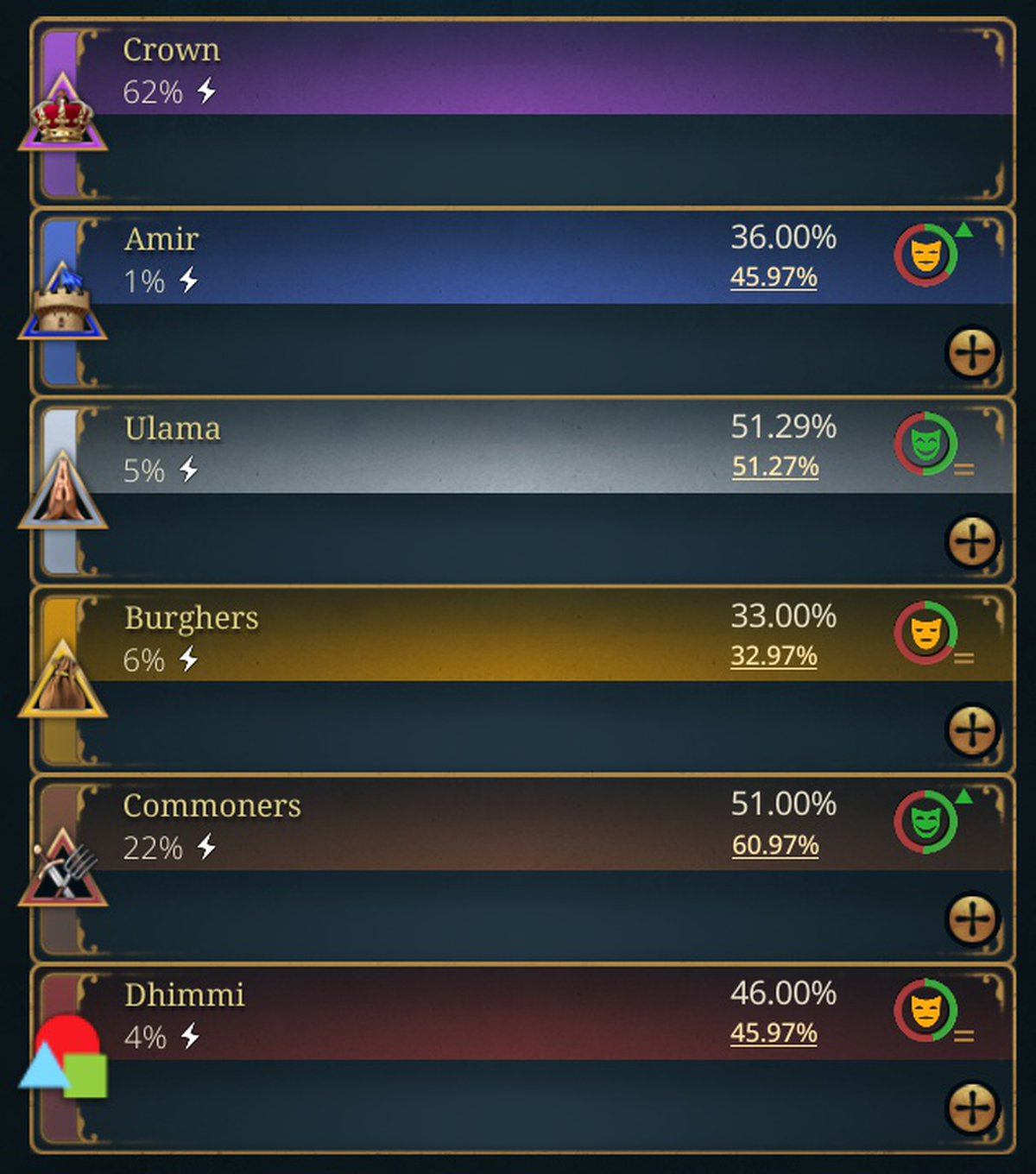 И удовлетворённость тоже зависит от разных действий правителя. Примеры: духовенство более удовлетворено высоким религиозным единством, бюргерам нравится иметь больше рыночных центров в вашей стране.