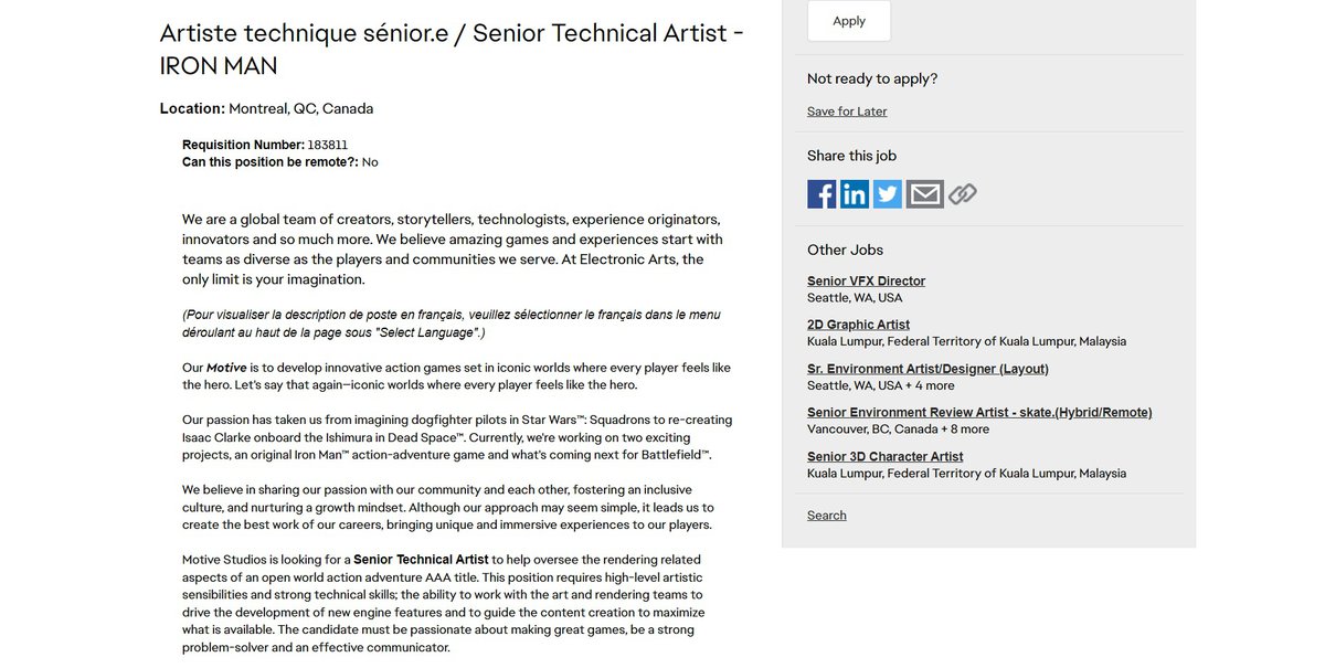 Как и в случае с игрой про Пантеру, упоминание открытого мира нашли в одной из вакансий. Студии Motive, занимающейся игрой, требуется старший технический художник для работы над открытым миром в команду Iron Man.