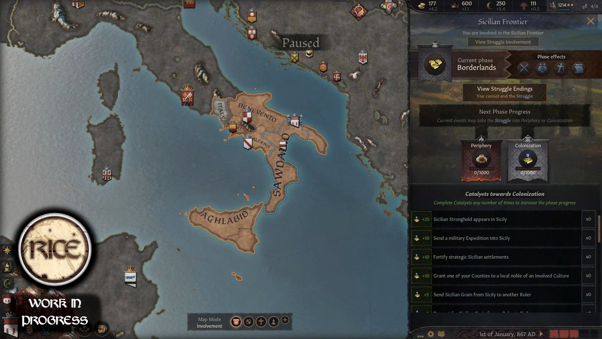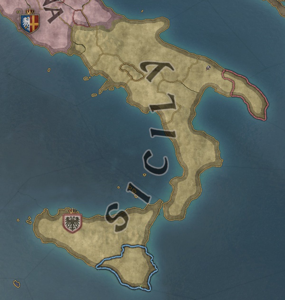 Для Сицилии автор делает целую борьбу про это - Сицилийский рубеж. И в борьбу включены земли титула Королевство Сицилия. Т.е. и Южная Италия. Сегодняшний дневник является лишь первой частью из трёх, описывающих контент Сицилии.