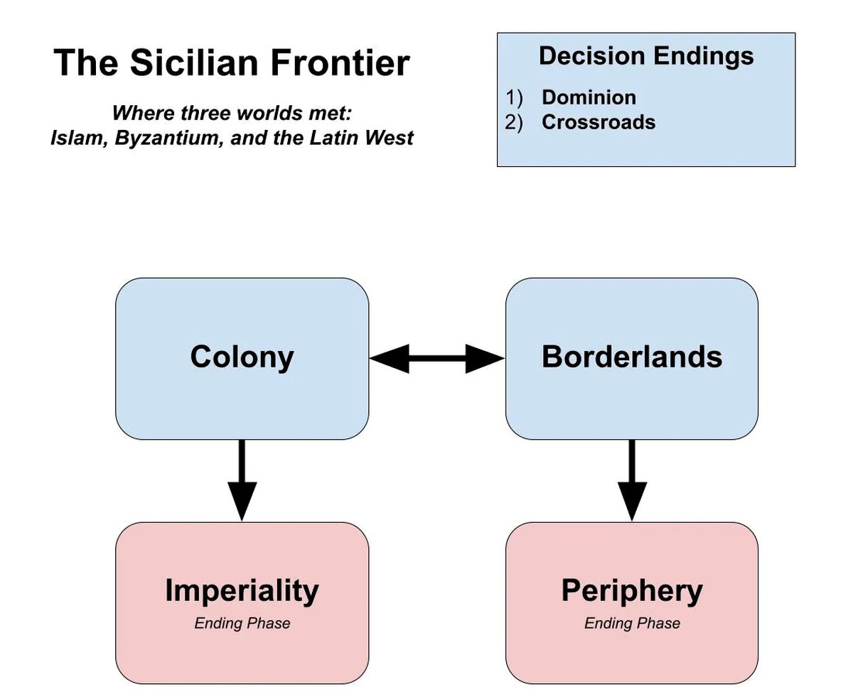Империалистическая концовка приведёт к тому, что какой-то один мир будет управлять Сицилией. Все правители получат модификатор правящего класса, который понизит им налоги и контроль за недальновидность и продажность. Новый хозяин теперь будет эксплуатировать регион.