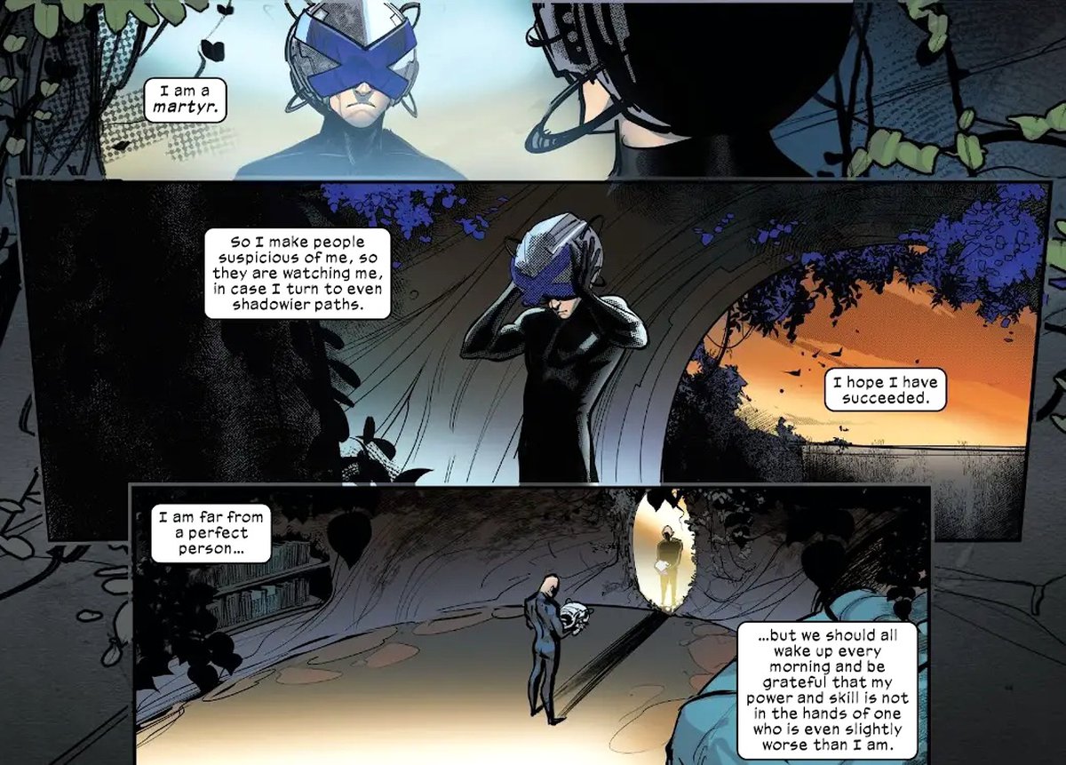 Речь, которую он произносит в Immortal X-Men #10, — это просто чистый Ксавье. Я думаю, что она действительно отлично показывает психологию персонажа таким образом, чтобы придать смысл кажущимся противоречиям. И эта история ещё не окончена. Очевидно, речь пойдет больше о том, что он делает и почему. Rise of the Powers of X #4 выйдет на этой неделе, так что после этого у вас будет дополнительная информация.