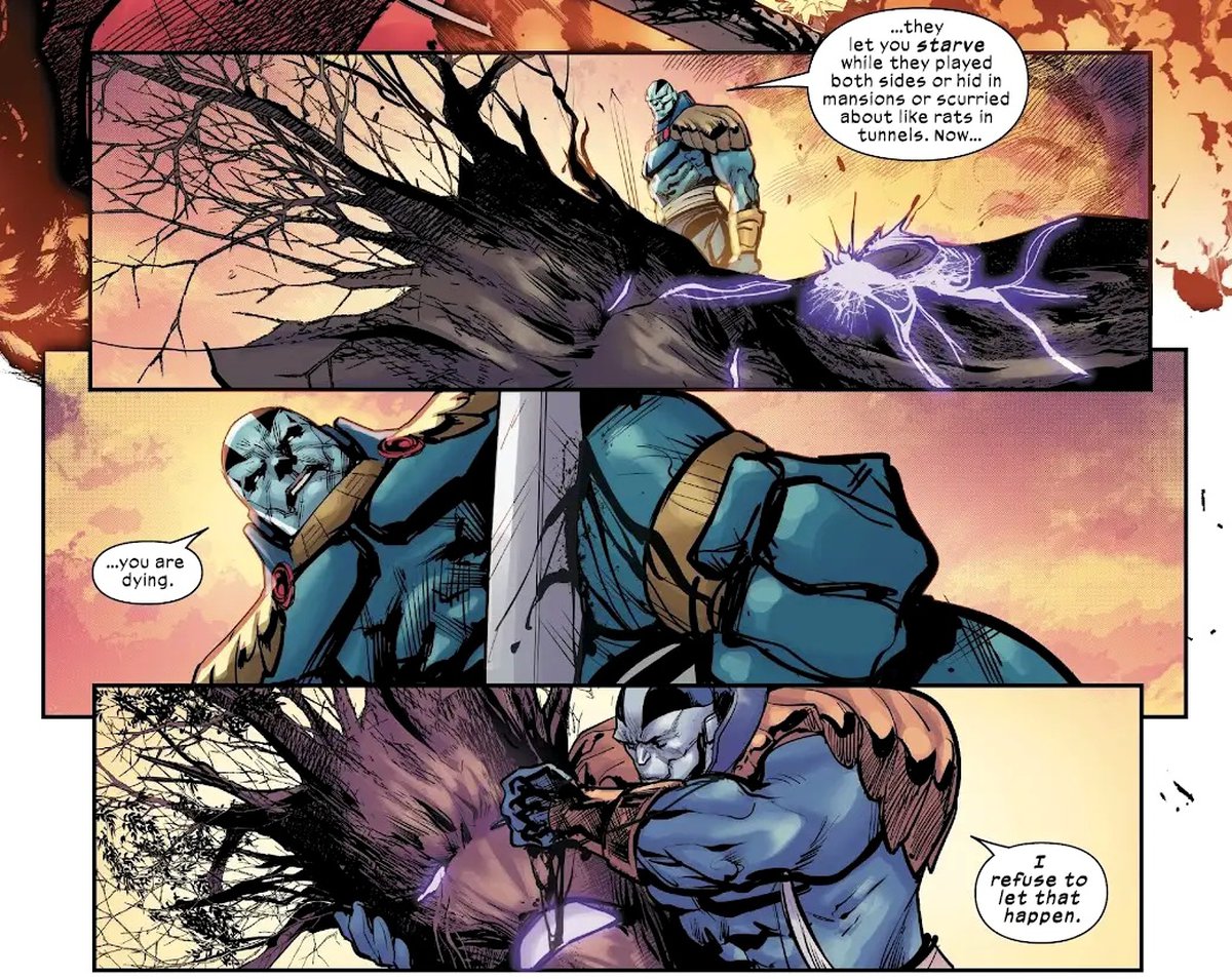 AIPT: Снова добро пожаловать в Икс-понедельник, Джордан! Fall of the House of X #4 начинается с Апокалипсиса, высмеивающего Orchis и сентинелов, построенных с помощью технологий Старка. Итак, позвольте мне задать Вам гипотетический вопрос: если бы Апокалипсис никогда не уходил в конце X of Swords, оказались бы мы сейчас в этом бардаке Fall of X?