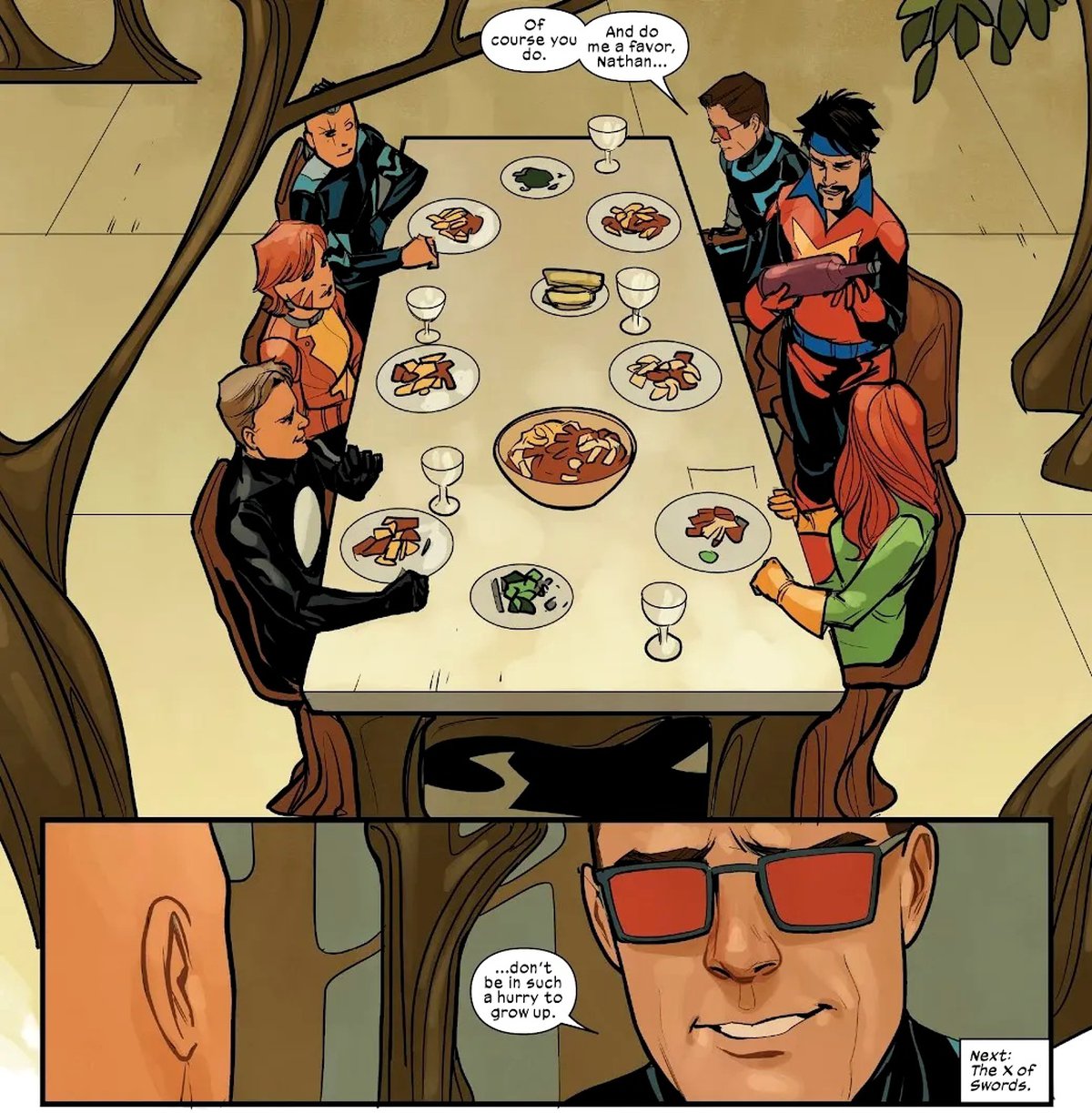 Джордан: О, хороший вопрос. Знаете, в X-Men #1 [2019 года] просто ужинает семья Саммерсов. Это было совсем другое чувство, чем то, что, я думаю, мы ожидаем увидеть в комиксах о Людях-Икс. Я имею в виду, что у Людей-Икс много найденных семей и много хороших моментов связи.