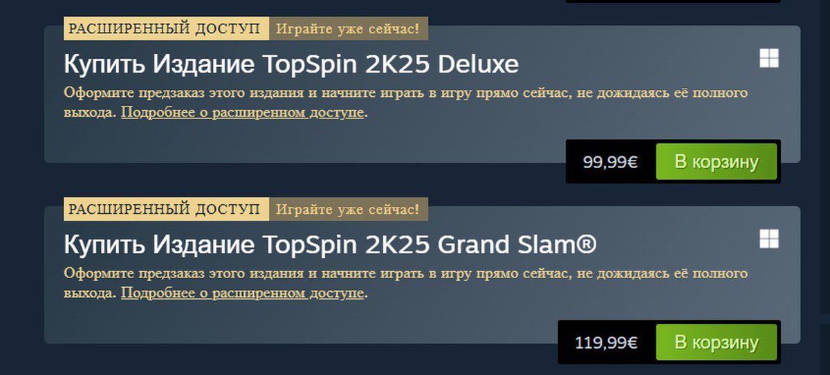 Пометка о том, что издание открывает ранний доступ к игре, выводится в общем списке изданий. Вот как она выглядит на примере TopSpin 2K25; кажется, разработчики Steam забыли настроить шрифты.