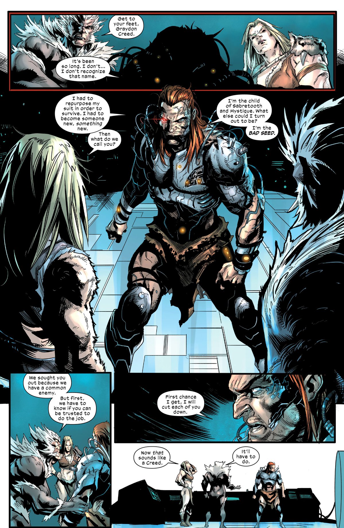 Маховик войны раскрутился до того, что Саблезубый лишил Логана регенерации, самого Виктора засунули в миниатюрную яму, а ещё Грейдон Крид, сынок Виктора, побывал в другом измерении, вернулся, и теперь мечтает убить вообще всех, наверное. Хотя он готов пойти на временный союз с Саблезубыми из параллельных вселенных.