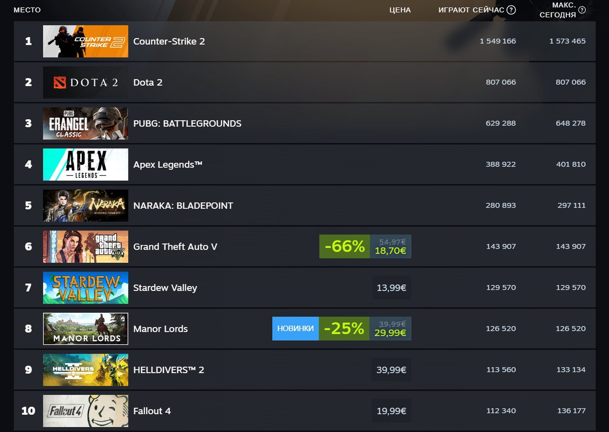 Через пару часов после релиза онлайн в Manor Lords стабилизировался на уровне 128 тысяч человек. Это позволило игре занять восьмое место в топе самых популярных игр Steam: впереди Stardew Valley, позади Helldivers 2.