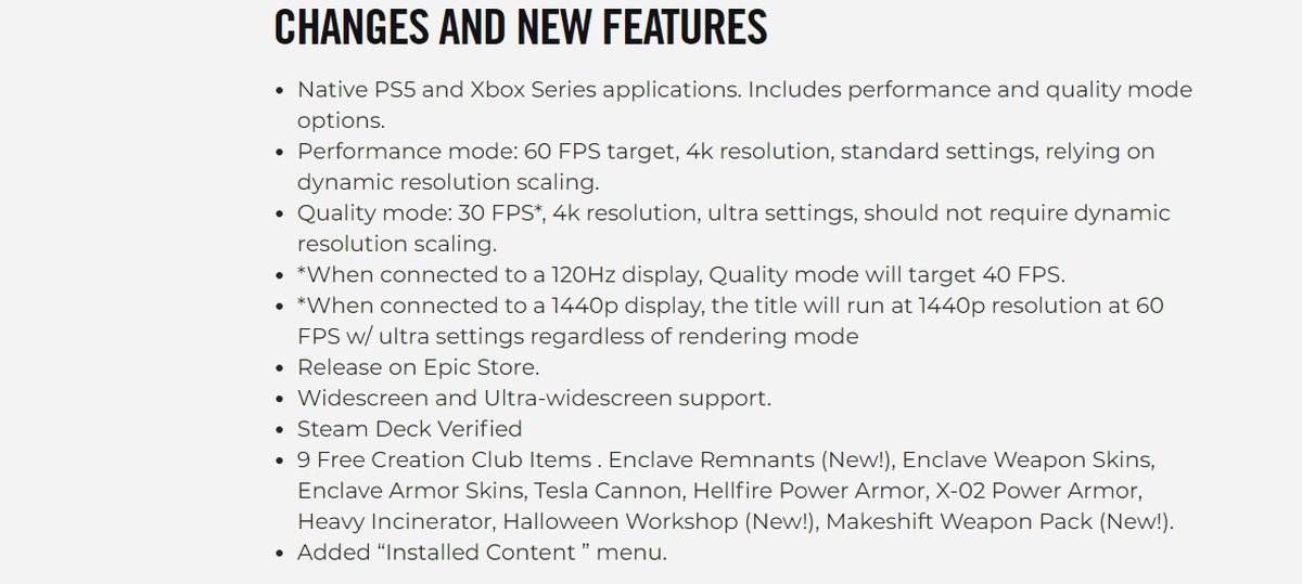 Некстген-версия Fallout 4 для PlayStation 5 и Xbox Series получила разные настройки графических режимов. Через пару дней после выхода патча разработчики пояснили, что на Xbox Series X игра получила отдельные настройки графических режимов.
