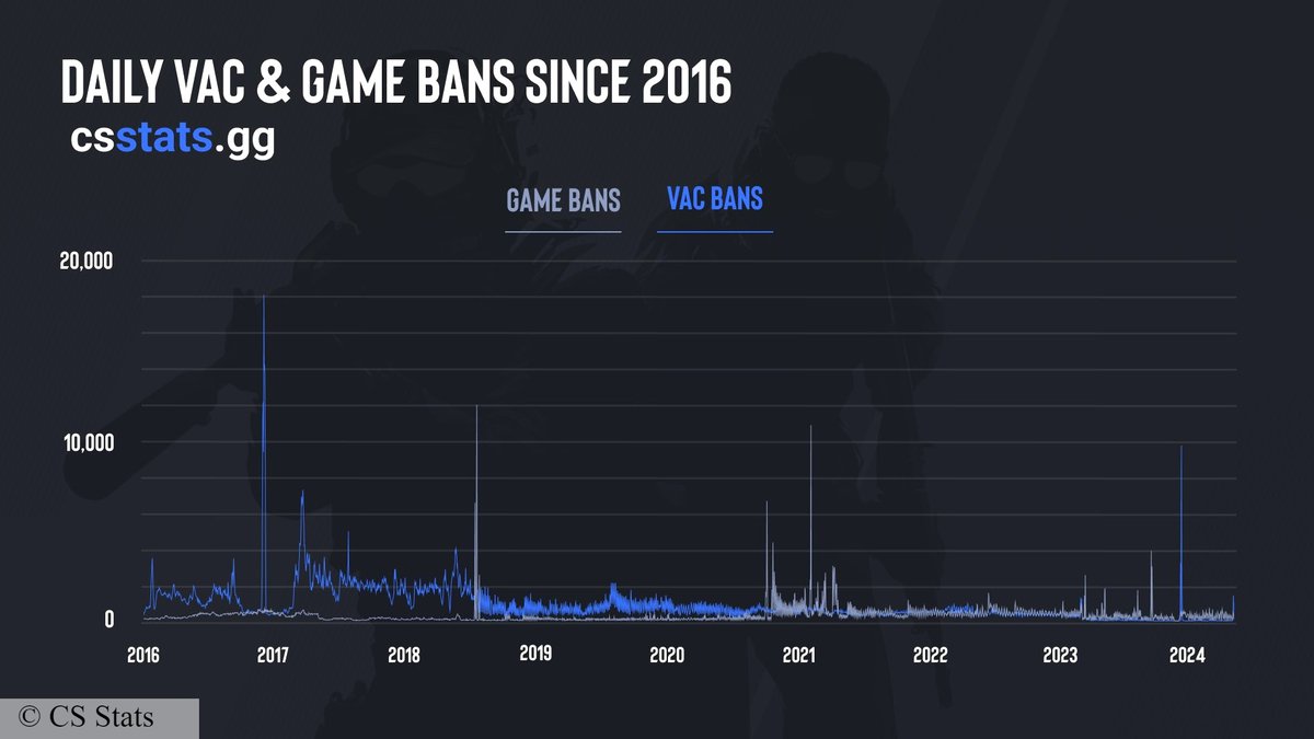 Согласно данным аналитического сервиса CS Stats, отслеживающего блокировки аккаунтов, сейчас разработчики Counter-Strike 2 и в самом деле активно блокируют читеров.