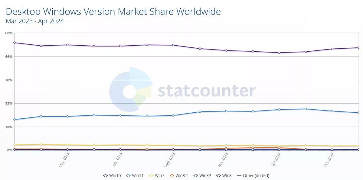 Благодаря этому росту рыночная доля Windows 10 впервые в 2024 году поднялась до уровня в 70%. Для сравнения: доля Windows 11 сейчас равна приблизительно 25%, оставшиеся 5% приходятся на более старые версии Windows.
